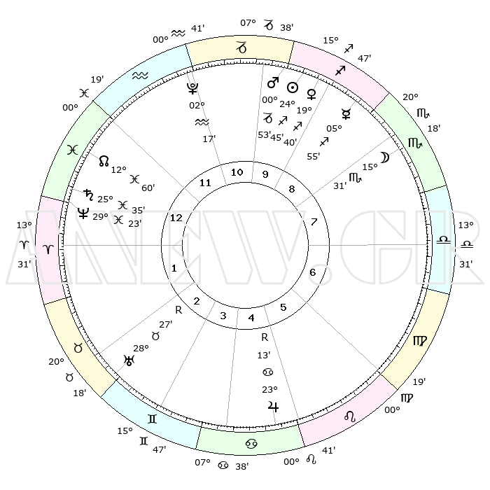 | | ΘΕΣΕΙΣ ΠΛΑΝΗΤΩΝ ΑΣΤΡΟΛΟΓΙΚΟΥ ΧΑΡΤΗ ΤΗΣ ΣΤΙΓΜΗΣ ΑΥΤΗΣ | | | | Πλανήτης | Ζώδιο | Μοίρες | Δεκαήμ. | Σε οίκο | Απόκλιση | | Ακμές των οίκων | | Ηλιος | Τοξότης | 24°24' | Τρίτο | 2 | 23 S 19 | | 1ος | 20°08' | Σκορπιός | | Σελήνη | Σκορπιός | 11°22' | Δεύτερο | 12 | 19 S 18 | | 2ος | 20°05' | Τοξότης | | Ερμής | Τοξότης | 05°27' | Πρώτο | 1 | 19 S 50 | | 3ος | 24°16' | Αιγόκερως | | Αφροδίτη | Τοξότης | 19°14' | Δεύτερο | 1 | 22 S 53 | | 4ος | 29°53' | Υδροχόος | | Αρης | Αιγόκερως | 00°37' | Πρώτο | 2 | 24 S 13 | | 5ος | 01°56' | Κριός | | Δίας | Καρκίνος | 23°15'R | Τρίτο | 8 | 21 N 38 | | 6ος | 28°19' | Κριός | | Κρόνος | Ιχθείς | 25°34' | Τρίτο | 4 | 03 S 53 | | 7ος | 20°08' | Ταύρος | | Ουρανός | Ταύρος | 28°27'R | Τρίτο | 7 | 19 N 37 | | 8ος | 20°05' | Δίδυμοι | | Ποσειδώνας | Ιχθείς | 29°23' | Τρίτο | 4 | 01 S 29 | | 9ος | 24°16' | Καρκίνος | | Πλούτωνας | Υδροχόος | 02°16' | Πρώτο | 3 | 23 S 19 | | 10ος | 29°53' | Λέων | | Β. Δεσμός | Ιχθείς | 13°01' | Δεύτερο | 4 | 06 S 40 | | 11ος | 01°56' | Ζυγός | | Ωροσκόπος | Σκορπιός | 20°08' | Τρίτο | | | 12ος | 28°19' | Ζυγός | | Μεσουράνημα | Λέων | 29°53' | Τρίτο | | | |