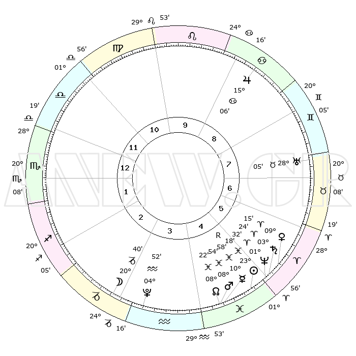 | | ΘΕΣΕΙΣ ΠΛΑΝΗΤΩΝ ΑΣΤΡΟΛΟΓΙΚΟΥ ΧΑΡΤΗ ΤΗΣ ΣΤΙΓΜΗΣ ΑΥΤΗΣ | | | | Πλανήτης | Ζώδιο | Μοίρες | Δεκαήμ. | Σε οίκο | Απόκλιση | | Ακμές των οίκων | | Ηλιος | Ιχθείς | 23°14' | Τρίτο | 5 | 02 S 41 | | 1ος | 01°37' | Σκορπιός | | Σελήνη | Αιγόκερως | 19°53' | Δεύτερο | 3 | 25 S 54 | | 2ος | 00°08' | Τοξότης | | Ερμής | Ιχθείς | 11°01'R | Δεύτερο | 5 | 04 S 57 | | 3ος | 02°13' | Αιγόκερως | | Αφροδίτη | Κριός | 09°10' | Πρώτο | 6 | 02 N 38 | | 4ος | 06°31' | Υδροχόος | | Αρης | Ιχθείς | 08°51' | Πρώτο | 4 | 09 S 15 | | 5ος | 09°25' | Ιχθείς | | Δίας | Καρκίνος | 15°06' | Δεύτερο | 9 | 22 N 56 | | 6ος | 07°56' | Κριός | | Κρόνος | Κριός | 03°24' | Πρώτο | 5 | 00 S 36 | | 7ος | 01°37' | Ταύρος | | Ουρανός | Ταύρος | 28°05' | Τρίτο | 7 | 19 N 33 | | 8ος | 00°08' | Δίδυμοι | | Ποσειδώνας | Κριός | 01°31' | Πρώτο | 5 | 00 S 36 | | 9ος | 02°13' | Καρκίνος | | Πλούτωνας | Υδροχόος | 04°52' | Πρώτο | 3 | 22 S 50 | | 10ος | 06°31' | Λέων | | Β. Δεσμός | Ιχθείς | 08°22' | Πρώτο | 4 | 08 S 26 | | 11ος | 09°25' | Παρθένος | | Ωροσκόπος | Σκορπιός | 01°37' | Πρώτο | | | 12ος | 07°56' | Ζυγός | | Μεσουράνημα | Λέων | 06°31' | Πρώτο | | | |