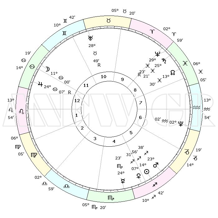 | | ΘΕΣΕΙΣ ΠΛΑΝΗΤΩΝ ΑΣΤΡΟΛΟΓΙΚΟΥ ΧΑΡΤΗ ΤΗΣ ΣΤΙΓΜΗΣ ΑΥΤΗΣ | | | | Πλανήτης | Ζώδιο | Μοίρες | Δεκαήμ. | Σε οίκο | Απόκλιση | | Ακμές των οίκων | | Ηλιος | Τοξότης | 14°54' | Δεύτερο | 5 | 22 S 35 | | 1ος | 01°12' | Λέων | | Σελήνη | Καρκίνος | 10°21' | Δεύτερο | 12 | 27 N 29 | | 2ος | 22°19' | Λέων | | Ερμής | Σκορπιός | 24°21' | Τρίτο | 4 | 16 S 30 | | 3ος | 17°31' | Παρθένος | | Αφροδίτη | Τοξότης | 07°28' | Πρώτο | 5 | 21 S 04 | | 4ος | 18°42' | Ζυγός | | Αρης | Τοξότης | 23°36' | Τρίτο | 5 | 23 S 59 | | 5ος | 24°43' | Σκορπιός | | Δίας | Καρκίνος | 24°07'R | Τρίτο | 12 | 21 N 27 | | 6ος | 00°14' | Αιγόκερως | | Κρόνος | Ιχθείς | 25°21' | Τρίτο | 9 | 04 S 00 | | 7ος | 01°12' | Υδροχόος | | Ουρανός | Ταύρος | 28°49'R | Τρίτο | 11 | 19 N 41 | | 8ος | 22°19' | Υδροχόος | | Ποσειδώνας | Ιχθείς | 29°23'R | Τρίτο | 9 | 01 S 29 | | 9ος | 17°31' | Ιχθείς | | Πλούτωνας | Υδροχόος | 02°02' | Πρώτο | 7 | 23 S 22 | | 10ος | 18°42' | Κριός | | Β. Δεσμός | Ιχθείς | 13°30' | Δεύτερο | 8 | 06 S 29 | | 11ος | 24°43' | Ταύρος | | Ωροσκόπος | Λέων | 01°12' | Πρώτο | | | 12ος | 00°14' | Καρκίνος | | Μεσουράνημα | Κριός | 18°42' | Δεύτερο | | | |