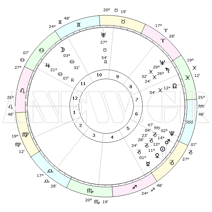 | | ΘΕΣΕΙΣ ΠΛΑΝΗΤΩΝ ΑΣΤΡΟΛΟΓΙΚΟΥ ΧΑΡΤΗ ΤΗΣ ΣΤΙΓΜΗΣ ΑΥΤΗΣ | | | | Πλανήτης | Ζώδιο | Μοίρες | Δεκαήμ. | Σε οίκο | Απόκλιση | | Ακμές των οίκων | | Ηλιος | Αιγόκερως | 12°19' | Δεύτερο | 6 | 22 S 52 | | 1ος | 04°04' | Λέων | | Σελήνη | Καρκίνος | 02°24' | Πρώτο | 11 | 28 N 07 | | 2ος | 25°23' | Λέων | | Ερμής | Αιγόκερως | 01°17' | Πρώτο | 5 | 24 S 11 | | 3ος | 20°59' | Παρθένος | | Αφροδίτη | Αιγόκερως | 11°22' | Δεύτερο | 6 | 23 S 31 | | 4ος | 22°30' | Ζυγός | | Αρης | Αιγόκερως | 14°00' | Δεύτερο | 6 | 23 S 36 | | 5ος | 28°25' | Σκορπιός | | Δίας | Καρκίνος | 21°08'R | Τρίτο | 12 | 22 N 01 | | 6ος | 03°27' | Αιγόκερως | | Κρόνος | Ιχθείς | 26°23' | Τρίτο | 9 | 03 S 30 | | 7ος | 04°04' | Υδροχόος | | Ουρανός | Ταύρος | 27°54'R | Τρίτο | 10 | 19 N 30 | | 8ος | 25°23' | Υδροχόος | | Ποσειδώνας | Ιχθείς | 29°32' | Τρίτο | 9 | 01 S 24 | | 9ος | 20°59' | Ιχθείς | | Πλούτωνας | Υδροχόος | 02°46' | Πρώτο | 6 | 23 S 12 | | 10ος | 22°30' | Κριός | | Β. Δεσμός | Ιχθείς | 12°05' | Δεύτερο | 8 | 07 S 02 | | 11ος | 28°25' | Ταύρος | | Ωροσκόπος | Λέων | 04°04' | Πρώτο | | | 12ος | 03°27' | Καρκίνος | | Μεσουράνημα | Κριός | 22°30' | Τρίτο | | | |