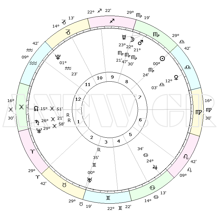 | | ΘΕΣΕΙΣ ΠΛΑΝΗΤΩΝ ΑΣΤΡΟΛΟΓΙΚΟΥ ΧΑΡΤΗ ΤΗΣ ΣΤΙΓΜΗΣ ΑΥΤΗΣ | | | | Πλανήτης | Ζώδιο | Μοίρες | Δεκαήμ. | Σε οίκο | Απόκλιση | | Ακμές των οίκων | | Ηλιος | Σκορπιός | 00°16' | Πρώτο | 9 | 11 S 34 | | 1ος | 09°18' | Αιγόκερως | | Σελήνη | Σκορπιός | 21°04' | Τρίτο | 10 | 22 S 27 | | 2ος | 18°50' | Υδροχόος | | Ερμής | Σκορπιός | 23°10' | Τρίτο | 10 | 21 S 00 | | 3ος | 29°08' | Ιχθείς | | Αφροδίτη | Ζυγός | 11°52' | Δεύτερο | 9 | 03 S 17 | | 4ος | 01°27' | Ταύρος | | Αρης | Σκορπιός | 21°24' | Τρίτο | 10 | 18 S 24 | | 5ος | 26°23' | Ταύρος | | Δίας | Καρκίνος | 24°33' | Τρίτο | 7 | 21 N 16 | | 6ος | 17°44' | Δίδυμοι | | Κρόνος | Ιχθείς | 26°22'R | Τρίτο | 2 | 03 S 44 | | 7ος | 09°18' | Καρκίνος | | Ουρανός | Δίδυμοι | 00°35'R | Πρώτο | 5 | 20 N 04 | | 8ος | 18°50' | Λέων | | Ποσειδώνας | Ιχθείς | 29°58'R | Τρίτο | 3 | 01 S 16 | | 9ος | 29°08' | Παρθένος | | Πλούτωνας | Υδροχόος | 01°23' | Πρώτο | 1 | 23 S 32 | | 10ος | 01°27' | Σκορπιός | | Β. Δεσμός | Ιχθείς | 15°51' | Δεύτερο | 2 | 05 S 35 | | 11ος | 26°23' | Σκορπιός | | Ωροσκόπος | Αιγόκερως | 09°18' | Πρώτο | | | 12ος | 17°44' | Τοξότης | | Μεσουράνημα | Σκορπιός | 01°27' | Πρώτο | | | |