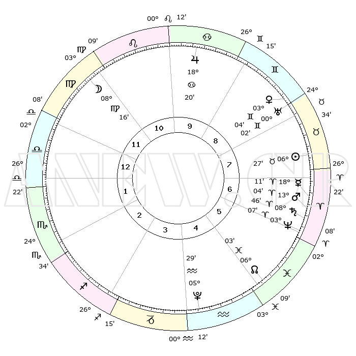 | | ΘΕΣΕΙΣ ΠΛΑΝΗΤΩΝ ΑΣΤΡΟΛΟΓΙΚΟΥ ΧΑΡΤΗ ΤΗΣ ΣΤΙΓΜΗΣ ΑΥΤΗΣ | | | | Πλανήτης | Ζώδιο | Μοίρες | Δεκαήμ. | Σε οίκο | Απόκλιση | | Ακμές των οίκων | | Ηλιος | Ταύρος | 06°23' | Πρώτο | 8 | 13 N 39 | | 1ος | 07°25' | Ζυγός | | Σελήνη | Παρθένος | 07°26' | Πρώτο | 11 | 08 N 46 | | 2ος | 04°30' | Σκορπιός | | Ερμής | Κριός | 18°05' | Δεύτερο | 7 | 04 N 56 | | 3ος | 05°13' | Τοξότης | | Αφροδίτη | Δίδυμοι | 02°59' | Πρώτο | 8 | 21 N 26 | | 4ος | 08°20' | Αιγόκερως | | Αρης | Κριός | 13°01' | Δεύτερο | 7 | 04 N 18 | | 5ος | 11°16' | Υδροχόος | | Δίας | Καρκίνος | 18°20' | Δεύτερο | 10 | 22 N 34 | | 6ος | 11°24' | Ιχθείς | | Κρόνος | Κριός | 08°46' | Πρώτο | 7 | 01 N 29 | | 7ος | 07°25' | Κριός | | Ουρανός | Δίδυμοι | 00°02' | Πρώτο | 8 | 19 N 59 | | 8ος | 04°30' | Ταύρος | | Ποσειδώνας | Κριός | 03°07' | Πρώτο | 6 | 00 N 02 | | 9ος | 05°13' | Δίδυμοι | | Πλούτωνας | Υδροχόος | 05°29' | Πρώτο | 4 | 22 S 48 | | 10ος | 08°20' | Καρκίνος | | Β. Δεσμός | Ιχθείς | 06°03' | Πρώτο | 5 | 09 S 17 | | 11ος | 11°16' | Λέων | | Ωροσκόπος | Ζυγός | 07°25' | Πρώτο | | | 12ος | 11°24' | Παρθένος | | Μεσουράνημα | Καρκίνος | 08°20' | Πρώτο | | | |