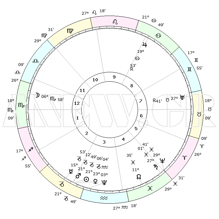 | | ΘΕΣΕΙΣ ΠΛΑΝΗΤΩΝ ΑΣΤΡΟΛΟΓΙΚΟΥ ΧΑΡΤΗ ΤΗΣ ΣΤΙΓΜΗΣ ΑΥΤΗΣ | | | | Πλανήτης | Ζώδιο | Μοίρες | Δεκαήμ. | Σε οίκο | Απόκλιση | | Ακμές των οίκων | | Ηλιος | Αιγόκερως | 21°43' | Τρίτο | 3 | 21 S 41 | | 1ος | 19°42' | Ζυγός | | Σελήνη | Σκορπιός | 05°49' | Πρώτο | 1 | 17 S 26 | | 2ος | 17°31' | Σκορπιός | | Ερμής | Αιγόκερως | 15°43' | Δεύτερο | 3 | 24 S 05 | | 3ος | 18°48' | Τοξότης | | Αφροδίτη | Αιγόκερως | 22°59' | Τρίτο | 4 | 22 S 21 | | 4ος | 22°22' | Αιγόκερως | | Αρης | Αιγόκερως | 21°07' | Τρίτο | 3 | 22 S 43 | | 5ος | 25°19' | Υδροχόος | | Δίας | Καρκίνος | 19°53'R | Δεύτερο | 9 | 22 N 13 | | 6ος | 24°47' | Ιχθείς | | Κρόνος | Ιχθείς | 27°01' | Τρίτο | 6 | 03 S 14 | | 7ος | 19°42' | Κριός | | Ουρανός | Ταύρος | 27°41'R | Τρίτο | 8 | 19 N 27 | | 8ος | 17°31' | Ταύρος | | Ποσειδώνας | Ιχθείς | 29°41' | Τρίτο | 6 | 01 S 21 | | 9ος | 18°48' | Δίδυμοι | | Πλούτωνας | Υδροχόος | 03°04' | Πρώτο | 4 | 23 S 09 | | 10ος | 22°22' | Καρκίνος | | Β. Δεσμός | Ιχθείς | 11°35' | Δεύτερο | 5 | 07 S 13 | | 11ος | 25°19' | Λέων | | Ωροσκόπος | Ζυγός | 19°42' | Δεύτερο | | | 12ος | 24°47' | Παρθένος | | Μεσουράνημα | Καρκίνος | 22°22' | Τρίτο | | | |