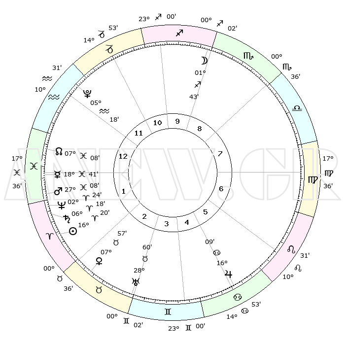 | | ΘΕΣΕΙΣ ΠΛΑΝΗΤΩΝ ΑΣΤΡΟΛΟΓΙΚΟΥ ΧΑΡΤΗ ΤΗΣ ΣΤΙΓΜΗΣ ΑΥΤΗΣ | | | | Πλανήτης | Ζώδιο | Μοίρες | Δεκαήμ. | Σε οίκο | Απόκλιση | | Ακμές των οίκων | | Ηλιος | Κριός | 16°16' | Δεύτερο | 2 | 06 N 24 | | 1ος | 10°48' | Υδροχόος | | Σελήνη | Τοξότης | 00°53' | Πρώτο | 10 | 25 S 20 | | 2ος | 26°14' | Ιχθείς | | Ερμής | Ιχθείς | 18°37' | Δεύτερο | 1 | 06 S 19 | | 3ος | 02°46' | Ταύρος | | Αφροδίτη | Ταύρος | 07°52' | Πρώτο | 3 | 13 N 55 | | 4ος | 29°31' | Ταύρος | | Αρης | Ιχθείς | 27°05' | Τρίτο | 2 | 02 S 06 | | 5ος | 21°38' | Δίδυμοι | | Δίας | Καρκίνος | 16°09' | Δεύτερο | 6 | 22 N 50 | | 6ος | 13°36' | Καρκίνος | | Κρόνος | Κριός | 06°17' | Πρώτο | 2 | 00 N 32 | | 7ος | 10°48' | Λέων | | Ουρανός | Ταύρος | 28°59' | Τρίτο | 3 | 19 N 46 | | 8ος | 26°14' | Παρθένος | | Ποσειδώνας | Κριός | 02°24' | Πρώτο | 2 | 00 S 15 | | 9ος | 02°46' | Σκορπιός | | Πλούτωνας | Υδροχόος | 05°18' | Πρώτο | 12 | 22 S 47 | | 10ος | 29°31' | Σκορπιός | | Β. Δεσμός | Ιχθείς | 07°08' | Πρώτο | 1 | 08 S 53 | | 11ος | 21°38' | Τοξότης | | Ωροσκόπος | Υδροχόος | 10°48' | Δεύτερο | | | 12ος | 13°36' | Αιγόκερως | | Μεσουράνημα | Σκορπιός | 29°31' | Τρίτο | | | |