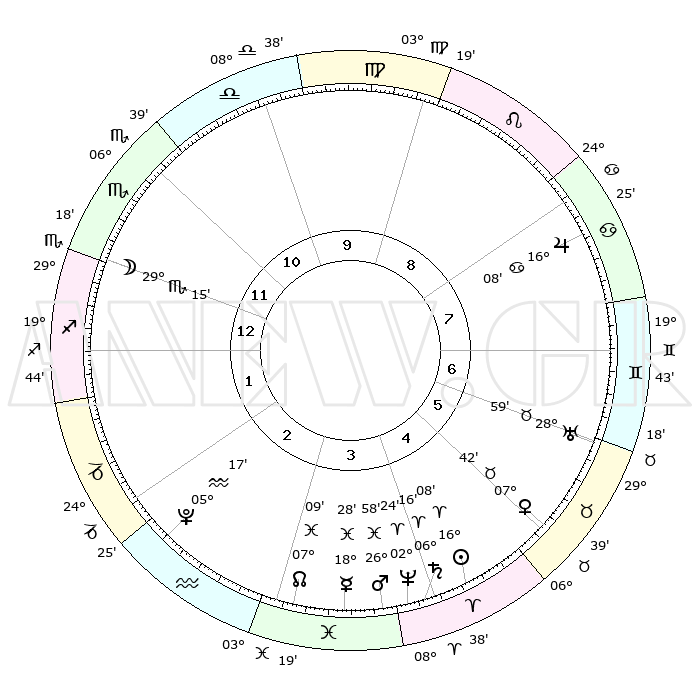 | | ΘΕΣΕΙΣ ΠΛΑΝΗΤΩΝ ΑΣΤΡΟΛΟΓΙΚΟΥ ΧΑΡΤΗ ΤΗΣ ΣΤΙΓΜΗΣ ΑΥΤΗΣ | | | | Πλανήτης | Ζώδιο | Μοίρες | Δεκαήμ. | Σε οίκο | Απόκλιση | | Ακμές των οίκων | | Ηλιος | Κριός | 16°04' | Δεύτερο | 5 | 06 N 19 | | 1ος | 01°08' | Τοξότης | | Σελήνη | Σκορπιός | 28°31' | Τρίτο | 12 | 24 S 47 | | 2ος | 02°25' | Αιγόκερως | | Ερμής | Ιχθείς | 18°24' | Δεύτερο | 4 | 06 S 23 | | 3ος | 08°19' | Υδροχόος | | Αφροδίτη | Ταύρος | 07°37' | Πρώτο | 5 | 13 N 50 | | 4ος | 14°23' | Ιχθείς | | Αρης | Ιχθείς | 26°55' | Τρίτο | 4 | 02 S 10 | | 5ος | 15°16' | Κριός | | Δίας | Καρκίνος | 16°08' | Δεύτερο | 8 | 22 N 50 | | 6ος | 10°10' | Ταύρος | | Κρόνος | Κριός | 06°16' | Πρώτο | 4 | 00 N 32 | | 7ος | 01°08' | Δίδυμοι | | Ουρανός | Ταύρος | 28°59' | Τρίτο | 6 | 19 N 46 | | 8ος | 02°25' | Καρκίνος | | Ποσειδώνας | Κριός | 02°23' | Πρώτο | 4 | 00 S 15 | | 9ος | 08°19' | Λέων | | Πλούτωνας | Υδροχόος | 05°17' | Πρώτο | 2 | 22 S 47 | | 10ος | 14°23' | Παρθένος | | Β. Δεσμός | Ιχθείς | 07°09' | Πρώτο | 3 | 08 S 53 | | 11ος | 15°16' | Ζυγός | | Ωροσκόπος | Τοξότης | 01°08' | Πρώτο | | | 12ος | 10°10' | Σκορπιός | | Μεσουράνημα | Παρθένος | 14°23' | Δεύτερο | | | |