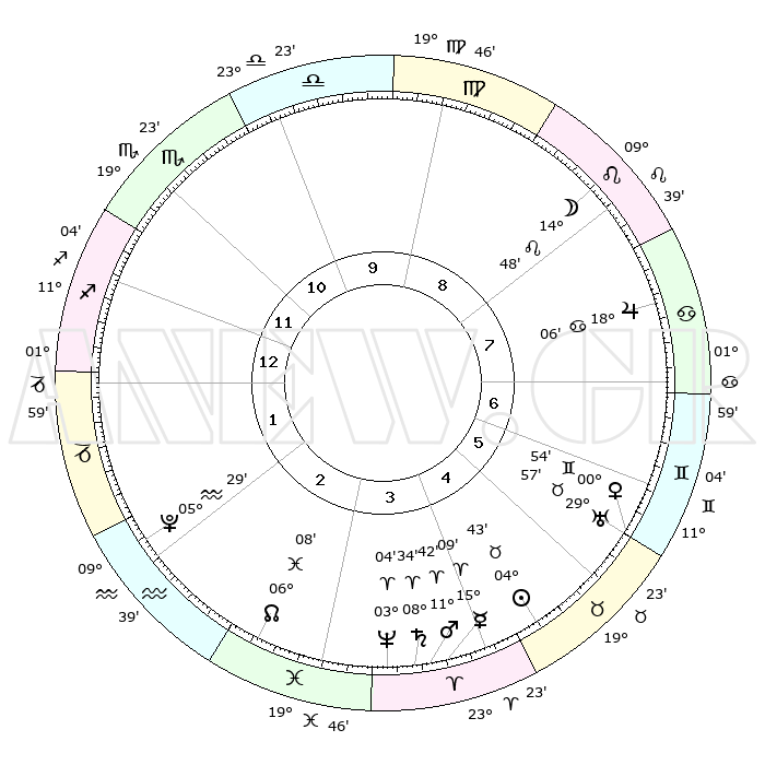 | | ΘΕΣΕΙΣ ΠΛΑΝΗΤΩΝ ΑΣΤΡΟΛΟΓΙΚΟΥ ΧΑΡΤΗ ΤΗΣ ΣΤΙΓΜΗΣ ΑΥΤΗΣ | | | | Πλανήτης | Ζώδιο | Μοίρες | Δεκαήμ. | Σε οίκο | Απόκλιση | | Ακμές των οίκων | | Ηλιος | Ταύρος | 02°51' | Πρώτο | 3 | 12 N 28 | | 1ος | 02°36' | Υδροχόος | | Σελήνη | Καρκίνος | 18°22' | Δεύτερο | 6 | 26 N 00 | | 2ος | 17°06' | Ιχθείς | | Ερμής | Κριός | 11°58' | Δεύτερο | 2 | 02 N 24 | | 3ος | 25°07' | Κριός | | Αφροδίτη | Ταύρος | 28°34' | Τρίτο | 4 | 20 N 22 | | 4ος | 23°09' | Ταύρος | | Αρης | Κριός | 10°13' | Δεύτερο | 2 | 03 N 11 | | 5ος | 15°44' | Δίδυμοι | | Δίας | Καρκίνος | 17°52' | Δεύτερο | 6 | 22 N 37 | | 6ος | 07°15' | Καρκίνος | | Κρόνος | Κριός | 08°20' | Πρώτο | 2 | 01 N 19 | | 7ος | 02°36' | Λέων | | Ουρανός | Ταύρος | 29°50' | Τρίτο | 4 | 19 N 57 | | 8ος | 17°06' | Παρθένος | | Ποσειδώνας | Κριός | 03°00' | Πρώτο | 2 | 00 S 01 | | 9ος | 25°07' | Ζυγός | | Πλούτωνας | Υδροχόος | 05°28' | Πρώτο | 1 | 22 S 48 | | 10ος | 23°09' | Σκορπιός | | Β. Δεσμός | Ιχθείς | 06°14' | Πρώτο | 1 | 09 S 13 | | 11ος | 15°44' | Τοξότης | | Ωροσκόπος | Υδροχόος | 02°36' | Πρώτο | | | 12ος | 07°15' | Αιγόκερως | | Μεσουράνημα | Σκορπιός | 23°09' | Τρίτο | | | |