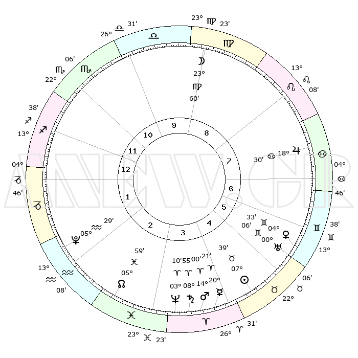 | | ΘΕΣΕΙΣ ΠΛΑΝΗΤΩΝ ΑΣΤΡΟΛΟΓΙΚΟΥ ΧΑΡΤΗ ΤΗΣ ΣΤΙΓΜΗΣ ΑΥΤΗΣ | | | | Πλανήτης | Ζώδιο | Μοίρες | Δεκαήμ. | Σε οίκο | Απόκλιση | | Ακμές των οίκων | | Ηλιος | Ταύρος | 05°11' | Πρώτο | 10 | 13 N 15 | | 1ος | 29°40' | Καρκίνος | | Σελήνη | Λέων | 21°15' | Τρίτο | 2 | 15 N 45 | | 2ος | 20°41' | Λέων | | Ερμής | Κριός | 15°58' | Δεύτερο | 9 | 04 N 03 | | 3ος | 15°41' | Παρθένος | | Αφροδίτη | Δίδυμοι | 01°29' | Πρώτο | 11 | 21 N 05 | | 4ος | 16°40' | Ζυγός | | Αρης | Κριός | 12°04' | Δεύτερο | 9 | 03 N 55 | | 5ος | 22°43' | Σκορπιός | | Δίας | Καρκίνος | 18°10' | Δεύτερο | 12 | 22 N 35 | | 6ος | 28°29' | Τοξότης | | Κρόνος | Κριός | 08°37' | Πρώτο | 9 | 01 N 26 | | 7ος | 29°40' | Αιγόκερως | | Ουρανός | Ταύρος | 29°58' | Τρίτο | 11 | 19 N 59 | | 8ος | 20°41' | Υδροχόος | | Ποσειδώνας | Κριός | 03°05' | Πρώτο | 9 | 00 N 01 | | 9ος | 15°41' | Ιχθείς | | Πλούτωνας | Υδροχόος | 05°29' | Πρώτο | 7 | 22 S 48 | | 10ος | 16°40' | Κριός | | Β. Δεσμός | Ιχθείς | 06°07' | Πρώτο | 8 | 09 S 16 | | 11ος | 22°44' | Ταύρος | | Ωροσκόπος | Καρκίνος | 29°40' | Τρίτο | | | 12ος | 28°29' | Δίδυμοι | | Μεσουράνημα | Κριός | 16°40' | Δεύτερο | | | |