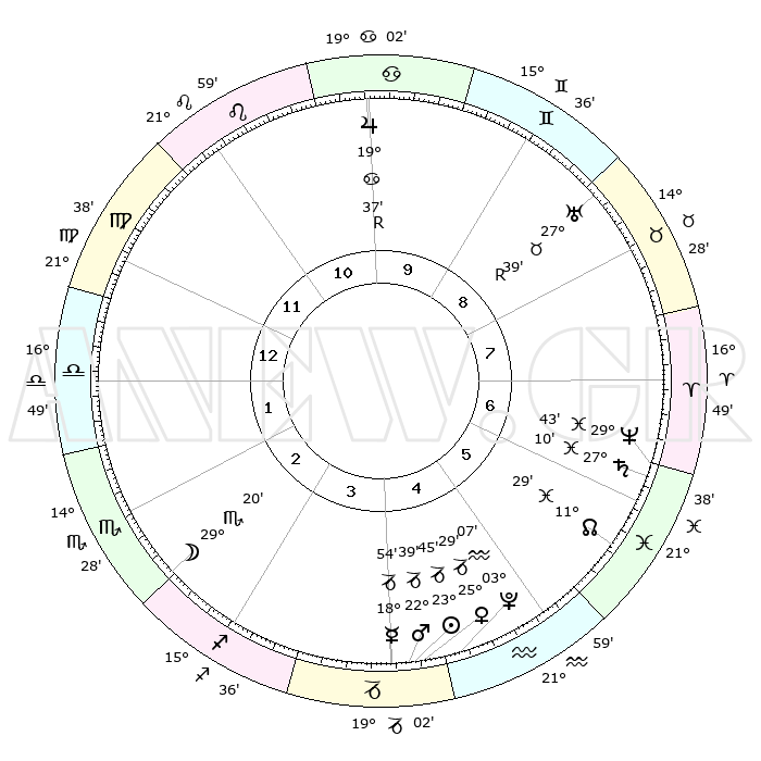 | | ΘΕΣΕΙΣ ΠΛΑΝΗΤΩΝ ΑΣΤΡΟΛΟΓΙΚΟΥ ΧΑΡΤΗ ΤΗΣ ΣΤΙΓΜΗΣ ΑΥΤΗΣ | | | | Πλανήτης | Ζώδιο | Μοίρες | Δεκαήμ. | Σε οίκο | Απόκλιση | | Ακμές των οίκων | | Ηλιος | Αιγόκερως | 23°40' | Τρίτο | 4 | 21 S 22 | | 1ος | 24°56' | Παρθένος | | Σελήνη | Σκορπιός | 28°28' | Τρίτο | 3 | 24 S 42 | | 2ος | 21°08' | Ζυγός | | Ερμής | Αιγόκερως | 18°47' | Δεύτερο | 4 | 23 S 49 | | 3ος | 21°22' | Σκορπιός | | Αφροδίτη | Αιγόκερως | 25°23' | Τρίτο | 4 | 21 S 59 | | 4ος | 24°18' | Τοξότης | | Αρης | Αιγόκερως | 22°36' | Τρίτο | 4 | 22 S 29 | | 5ος | 27°21' | Αιγόκερως | | Δίας | Καρκίνος | 19°38'R | Δεύτερο | 10 | 22 N 16 | | 6ος | 27°59' | Υδροχόος | | Κρόνος | Ιχθείς | 27°09' | Τρίτο | 7 | 03 S 10 | | 7ος | 24°56' | Ιχθείς | | Ουρανός | Ταύρος | 27°39'R | Τρίτο | 9 | 19 N 26 | | 8ος | 21°08' | Κριός | | Ποσειδώνας | Ιχθείς | 29°43' | Τρίτο | 7 | 01 S 20 | | 9ος | 21°22' | Ταύρος | | Πλούτωνας | Υδροχόος | 03°07' | Πρώτο | 5 | 23 S 08 | | 10ος | 24°18' | Δίδυμοι | | Β. Δεσμός | Ιχθείς | 11°29' | Δεύτερο | 6 | 07 S 15 | | 11ος | 27°21' | Καρκίνος | | Ωροσκόπος | Παρθένος | 24°56' | Τρίτο | | | 12ος | 27°59' | Λέων | | Μεσουράνημα | Δίδυμοι | 24°18' | Τρίτο | | | |