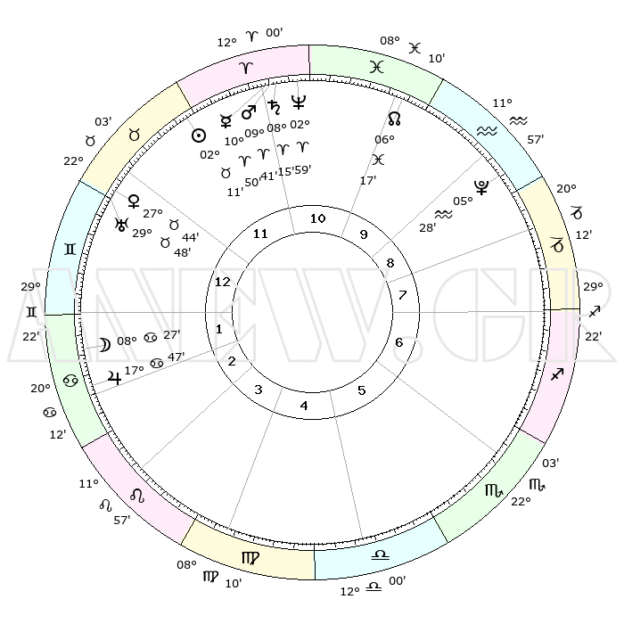 | | ΘΕΣΕΙΣ ΠΛΑΝΗΤΩΝ ΑΣΤΡΟΛΟΓΙΚΟΥ ΧΑΡΤΗ ΤΗΣ ΣΤΙΓΜΗΣ ΑΥΤΗΣ | | | | Πλανήτης | Ζώδιο | Μοίρες | Δεκαήμ. | Σε οίκο | Απόκλιση | | Ακμές των οίκων | | Ηλιος | Ταύρος | 02°07' | Πρώτο | 12 | 12 N 12 | | 1ος | 07°30' | Δίδυμοι | | Σελήνη | Καρκίνος | 07°35' | Πρώτο | 2 | 27 N 37 | | 2ος | 00°55' | Καρκίνος | | Ερμής | Κριός | 10°44' | Δεύτερο | 11 | 01 N 53 | | 3ος | 22°09' | Καρκίνος | | Αφροδίτη | Ταύρος | 27°39' | Τρίτο | 12 | 20 N 07 | | 4ος | 15°33' | Λέων | | Αρης | Κριός | 09°38' | Πρώτο | 11 | 02 N 57 | | 5ος | 15°22' | Παρθένος | | Δίας | Καρκίνος | 17°47' | Δεύτερο | 2 | 22 N 38 | | 6ος | 24°50' | Ζυγός | | Κρόνος | Κριός | 08°15' | Πρώτο | 11 | 01 N 17 | | 7ος | 07°30' | Τοξότης | | Ουρανός | Ταύρος | 29°48' | Τρίτο | 12 | 19 N 56 | | 8ος | 00°55' | Αιγόκερως | | Ποσειδώνας | Κριός | 02°59' | Πρώτο | 11 | 00 S 01 | | 9ος | 22°09' | Αιγόκερως | | Πλούτωνας | Υδροχόος | 05°28' | Πρώτο | 9 | 22 S 48 | | 10ος | 15°33' | Υδροχόος | | Β. Δεσμός | Ιχθείς | 06°17' | Πρώτο | 10 | 09 S 12 | | 11ος | 15°22' | Ιχθείς | | Ωροσκόπος | Δίδυμοι | 07°30' | Πρώτο | | | 12ος | 24°50' | Κριός | | Μεσουράνημα | Υδροχόος | 15°33' | Δεύτερο | | | |
