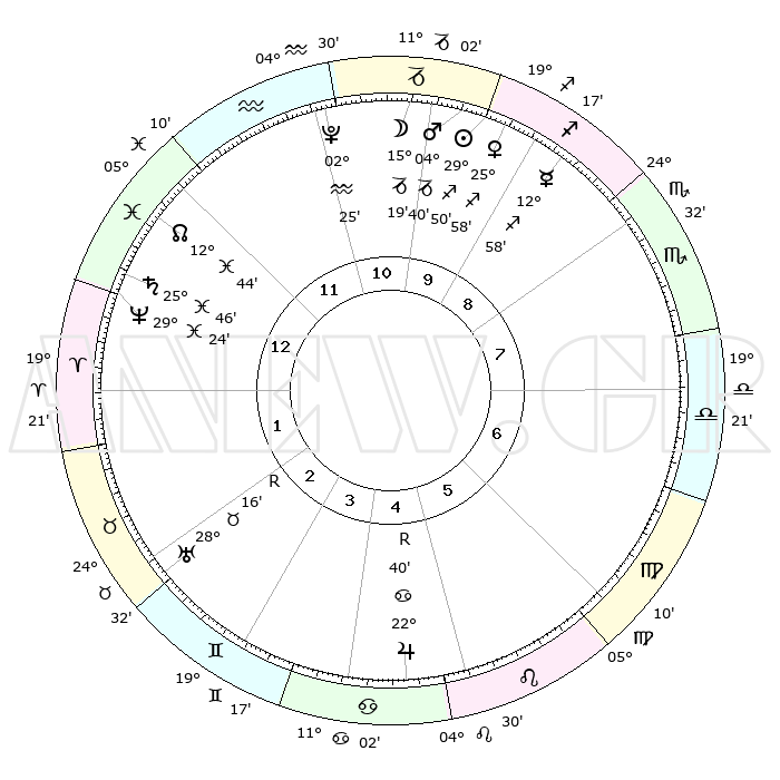 | | ΘΕΣΕΙΣ ΠΛΑΝΗΤΩΝ ΑΣΤΡΟΛΟΓΙΚΟΥ ΧΑΡΤΗ ΤΗΣ ΣΤΙΓΜΗΣ ΑΥΤΗΣ | | | | Πλανήτης | Ζώδιο | Μοίρες | Δεκαήμ. | Σε οίκο | Απόκλιση | | Ακμές των οίκων | | Ηλιος | Τοξότης | 29°46' | Τρίτο | 10 | 23 S 26 | | 1ος | 10°54' | Ιχθείς | | Σελήνη | Αιγόκερως | 14°31' | Δεύτερο | 11 | 26 S 50 | | 2ος | 25°03' | Κριός | | Ερμής | Τοξότης | 12°52' | Δεύτερο | 9 | 21 S 38 | | 3ος | 25°41' | Ταύρος | | Αφροδίτη | Τοξότης | 25°53' | Τρίτο | 10 | 23 S 28 | | 4ος | 19°08' | Δίδυμοι | | Αρης | Αιγόκερως | 04°37' | Πρώτο | 10 | 24 S 10 | | 5ος | 10°52' | Καρκίνος | | Δίας | Καρκίνος | 22°40'R | Τρίτο | 5 | 21 N 44 | | 6ος | 05°39' | Λέων | | Κρόνος | Ιχθείς | 25°46' | Τρίτο | 1 | 03 S 48 | | 7ος | 10°54' | Παρθένος | | Ουρανός | Ταύρος | 28°16'R | Τρίτο | 3 | 19 N 34 | | 8ος | 25°03' | Ζυγός | | Ποσειδώνας | Ιχθείς | 29°24' | Τρίτο | 1 | 01 S 28 | | 9ος | 25°41' | Σκορπιός | | Πλούτωνας | Υδροχόος | 02°25' | Πρώτο | 11 | 23 S 17 | | 10ος | 19°08' | Τοξότης | | Β. Δεσμός | Ιχθείς | 12°44' | Δεύτερο | 1 | 06 S 47 | | 11ος | 10°52' | Αιγόκερως | | Ωροσκόπος | Ιχθείς | 10°54' | Δεύτερο | | | 12ος | 05°39' | Υδροχόος | | Μεσουράνημα | Τοξότης | 19°08' | Δεύτερο | | | |