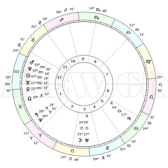 | | ΘΕΣΕΙΣ ΠΛΑΝΗΤΩΝ ΑΣΤΡΟΛΟΓΙΚΟΥ ΧΑΡΤΗ ΤΗΣ ΣΤΙΓΜΗΣ ΑΥΤΗΣ | | | | Πλανήτης | Ζώδιο | Μοίρες | Δεκαήμ. | Σε οίκο | Απόκλιση | | Ακμές των οίκων | | Ηλιος | Υδροχόος | 07°15' | Πρώτο | 1 | 18 S 27 | | 1ος | 19°27' | Αιγόκερως | | Σελήνη | Ταύρος | 20°16' | Τρίτο | 4 | 22 N 32 | | 2ος | 01°27' | Ιχθείς | | Ερμής | Υδροχόος | 11°04' | Δεύτερο | 1 | 19 S 26 | | 3ος | 11°14' | Κριός | | Αφροδίτη | Υδροχόος | 12°09' | Δεύτερο | 1 | 18 S 23 | | 4ος | 11°37' | Ταύρος | | Αρης | Υδροχόος | 02°59' | Πρώτο | 1 | 20 S 29 | | 5ος | 05°20' | Δίδυμοι | | Δίας | Καρκίνος | 17°55'R | Δεύτερο | 6 | 22 N 32 | | 6ος | 26°32' | Δίδυμοι | | Κρόνος | Ιχθείς | 28°18' | Τρίτο | 2 | 02 S 41 | | 7ος | 19°27' | Καρκίνος | | Ουρανός | Ταύρος | 27°29'R | Τρίτο | 4 | 19 N 24 | | 8ος | 01°27' | Παρθένος | | Ποσειδώνας | Κριός | 00°01' | Πρώτο | 2 | 01 S 12 | | 9ος | 11°14' | Ζυγός | | Πλούτωνας | Υδροχόος | 03°33' | Πρώτο | 1 | 23 S 03 | | 10ος | 11°37' | Σκορπιός | | Β. Δεσμός | Ιχθείς | 10°47' | Δεύτερο | 2 | 07 S 31 | | 11ος | 05°20' | Τοξότης | | Ωροσκόπος | Αιγόκερως | 19°27' | Δεύτερο | | | 12ος | 26°32' | Τοξότης | | Μεσουράνημα | Σκορπιός | 11°37' | Δεύτερο | | | |
