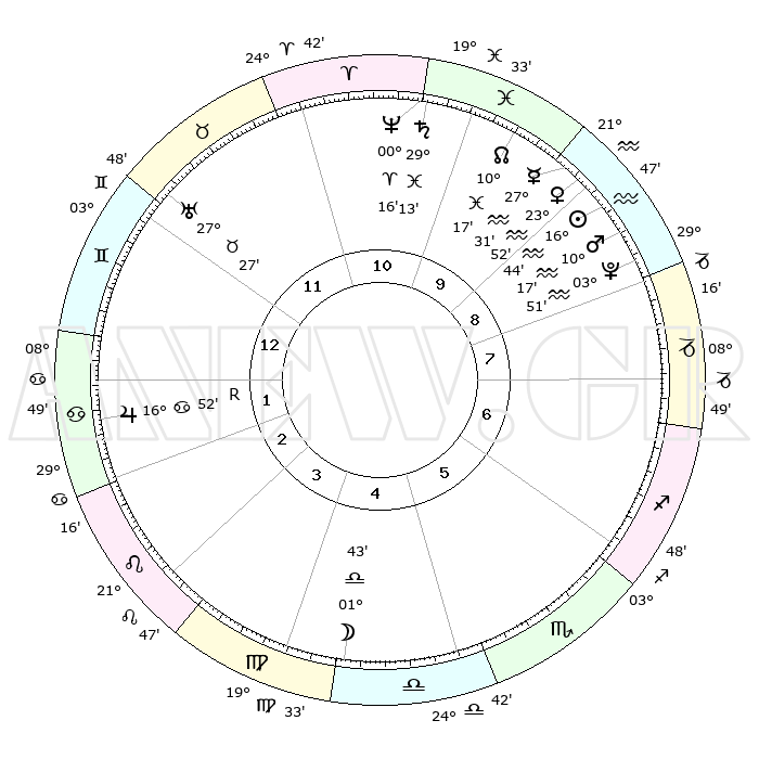 | | ΘΕΣΕΙΣ ΠΛΑΝΗΤΩΝ ΑΣΤΡΟΛΟΓΙΚΟΥ ΧΑΡΤΗ ΤΗΣ ΣΤΙΓΜΗΣ ΑΥΤΗΣ | | | | Πλανήτης | Ζώδιο | Μοίρες | Δεκαήμ. | Σε οίκο | Απόκλιση | | Ακμές των οίκων | | Ηλιος | Υδροχόος | 16°39' | Δεύτερο | 9 | 15 S 50 | | 1ος | 14°15' | Δίδυμοι | | Σελήνη | Ζυγός | 00°47' | Πρώτο | 5 | 02 S 06 | | 2ος | 06°37' | Καρκίνος | | Ερμής | Υδροχόος | 27°23' | Τρίτο | 10 | 13 S 48 | | 3ος | 27°50' | Καρκίνος | | Αφροδίτη | Υδροχόος | 23°47' | Τρίτο | 10 | 14 S 56 | | 4ος | 21°57' | Λέων | | Αρης | Υδροχόος | 10°14' | Δεύτερο | 9 | 18 S 42 | | 5ος | 23°03' | Παρθένος | | Δίας | Καρκίνος | 16°53'R | Δεύτερο | 2 | 22 N 41 | | 6ος | 03°07' | Σκορπιός | | Κρόνος | Ιχθείς | 29°12' | Τρίτο | 11 | 02 S 18 | | 7ος | 14°15' | Τοξότης | | Ουρανός | Ταύρος | 27°27' | Τρίτο | 12 | 19 N 24 | | 8ος | 06°37' | Αιγόκερως | | Ποσειδώνας | Κριός | 00°16' | Πρώτο | 11 | 01 S 06 | | 9ος | 27°50' | Αιγόκερως | | Πλούτωνας | Υδροχόος | 03°51' | Πρώτο | 9 | 23 S 00 | | 10ος | 21°57' | Υδροχόος | | Β. Δεσμός | Ιχθείς | 10°18' | Δεύτερο | 10 | 07 S 42 | | 11ος | 23°03' | Ιχθείς | | Ωροσκόπος | Δίδυμοι | 14°15' | Δεύτερο | | | 12ος | 03°07' | Ταύρος | | Μεσουράνημα | Υδροχόος | 21°57' | Τρίτο | | | |