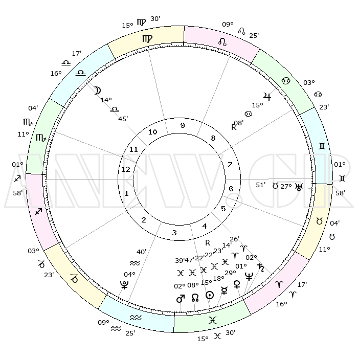 | | ΘΕΣΕΙΣ ΠΛΑΝΗΤΩΝ ΑΣΤΡΟΛΟΓΙΚΟΥ ΧΑΡΤΗ ΤΗΣ ΣΤΙΓΜΗΣ ΑΥΤΗΣ | | | | Πλανήτης | Ζώδιο | Μοίρες | Δεκαήμ. | Σε οίκο | Απόκλιση | | Ακμές των οίκων | | Ηλιος | Ιχθείς | 15°18' | Δεύτερο | 4 | 05 S 47 | | 1ος | 14°25' | Σκορπιός | | Σελήνη | Ζυγός | 13°59' | Δεύτερο | 11 | 08 S 18 | | 2ος | 13°50' | Τοξότης | | Ερμής | Ιχθείς | 18°26'R | Δεύτερο | 4 | 01 S 11 | | 3ος | 17°15' | Αιγόκερως | | Αφροδίτη | Ιχθείς | 29°18' | Τρίτο | 5 | 01 S 27 | | 4ος | 22°29' | Υδροχόος | | Αρης | Ιχθείς | 02°36' | Πρώτο | 4 | 11 S 34 | | 5ος | 24°56' | Ιχθείς | | Δίας | Καρκίνος | 15°08'R | Δεύτερο | 8 | 22 N 55 | | 6ος | 22°03' | Κριός | | Κρόνος | Κριός | 02°26' | Πρώτο | 5 | 00 S 59 | | 7ος | 14°25' | Ταύρος | | Ουρανός | Ταύρος | 27°51' | Τρίτο | 7 | 19 N 30 | | 8ος | 13°50' | Δίδυμοι | | Ποσειδώνας | Κριός | 01°14' | Πρώτο | 5 | 00 S 43 | | 9ος | 17°15' | Καρκίνος | | Πλούτωνας | Υδροχόος | 04°40' | Πρώτο | 3 | 22 S 51 | | 10ος | 22°29' | Λέων | | Β. Δεσμός | Ιχθείς | 08°47' | Πρώτο | 4 | 08 S 16 | | 11ος | 24°56' | Παρθένος | | Ωροσκόπος | Σκορπιός | 14°25' | Δεύτερο | | | 12ος | 22°03' | Ζυγός | | Μεσουράνημα | Λέων | 22°29' | Τρίτο | | | |