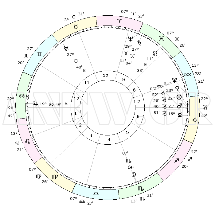 | | ΘΕΣΕΙΣ ΠΛΑΝΗΤΩΝ ΑΣΤΡΟΛΟΓΙΚΟΥ ΧΑΡΤΗ ΤΗΣ ΣΤΙΓΜΗΣ ΑΥΤΗΣ | | | | Πλανήτης | Ζώδιο | Μοίρες | Δεκαήμ. | Σε οίκο | Απόκλιση | | Ακμές των οίκων | | Ηλιος | Αιγόκερως | 22°19' | Τρίτο | 8 | 21 S 35 | | 1ος | 13°38' | Δίδυμοι | | Σελήνη | Σκορπιός | 12°42' | Δεύτερο | 6 | 19 S 58 | | 2ος | 06°05' | Καρκίνος | | Ερμής | Αιγόκερως | 16°39' | Δεύτερο | 8 | 24 S 01 | | 3ος | 27°18' | Καρκίνος | | Αφροδίτη | Αιγόκερως | 23°43' | Τρίτο | 8 | 22 S 15 | | 4ος | 21°21' | Λέων | | Αρης | Αιγόκερως | 21°34' | Τρίτο | 8 | 22 S 39 | | 5ος | 22°19' | Παρθένος | | Δίας | Καρκίνος | 19°49'R | Δεύτερο | 2 | 22 N 14 | | 6ος | 02°21' | Σκορπιός | | Κρόνος | Ιχθείς | 27°03' | Τρίτο | 11 | 03 S 13 | | 7ος | 13°38' | Τοξότης | | Ουρανός | Ταύρος | 27°40'R | Τρίτο | 12 | 19 N 27 | | 8ος | 06°05' | Αιγόκερως | | Ποσειδώνας | Ιχθείς | 29°41' | Τρίτο | 11 | 01 S 20 | | 9ος | 27°18' | Αιγόκερως | | Πλούτωνας | Υδροχόος | 03°05' | Πρώτο | 9 | 23 S 09 | | 10ος | 21°21' | Υδροχόος | | Β. Δεσμός | Ιχθείς | 11°34' | Δεύτερο | 10 | 07 S 14 | | 11ος | 22°19' | Ιχθείς | | Ωροσκόπος | Δίδυμοι | 13°38' | Δεύτερο | | | 12ος | 02°21' | Ταύρος | | Μεσουράνημα | Υδροχόος | 21°21' | Τρίτο | | | |