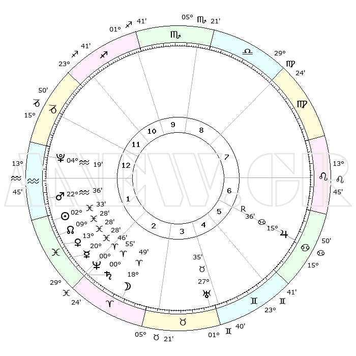 | | ΘΕΣΕΙΣ ΠΛΑΝΗΤΩΝ ΑΣΤΡΟΛΟΓΙΚΟΥ ΧΑΡΤΗ ΤΗΣ ΣΤΙΓΜΗΣ ΑΥΤΗΣ | | | | Πλανήτης | Ζώδιο | Μοίρες | Δεκαήμ. | Σε οίκο | Απόκλιση | | Ακμές των οίκων | | Ηλιος | Ιχθείς | 02°29' | Πρώτο | 2 | 10 S 35 | | 1ος | 14°47' | Αιγόκερως | | Σελήνη | Κριός | 17°51' | Δεύτερο | 3 | 10 N 05 | | 2ος | 25°42' | Υδροχόος | | Ερμής | Ιχθείς | 20°25' | Τρίτο | 2 | 02 S 23 | | 3ος | 05°49' | Κριός | | Αφροδίτη | Ιχθείς | 13°23' | Δεύτερο | 2 | 07 S 52 | | 4ος | 07°06' | Ταύρος | | Αρης | Υδροχόος | 22°32' | Τρίτο | 1 | 15 S 02 | | 5ος | 01°19' | Δίδυμοι | | Δίας | Καρκίνος | 15°37'R | Δεύτερο | 7 | 22 N 51 | | 6ος | 22°33' | Δίδυμοι | | Κρόνος | Κριός | 00°55' | Πρώτο | 2 | 01 S 36 | | 7ος | 14°47' | Καρκίνος | | Ουρανός | Ταύρος | 27°35' | Τρίτο | 4 | 19 N 26 | | 8ος | 25°42' | Λέων | | Ποσειδώνας | Κριός | 00°46' | Πρώτο | 2 | 00 S 54 | | 9ος | 05°49' | Ζυγός | | Πλούτωνας | Υδροχόος | 04°19' | Πρώτο | 1 | 22 S 55 | | 10ος | 07°06' | Σκορπιός | | Β. Δεσμός | Ιχθείς | 09°28' | Πρώτο | 2 | 08 S 01 | | 11ος | 01°19' | Τοξότης | | Ωροσκόπος | Αιγόκερως | 14°47' | Δεύτερο | | | 12ος | 22°33' | Τοξότης | | Μεσουράνημα | Σκορπιός | 07°06' | Πρώτο | | | |