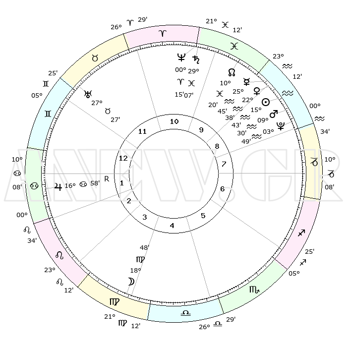 | | ΘΕΣΕΙΣ ΠΛΑΝΗΤΩΝ ΑΣΤΡΟΛΟΓΙΚΟΥ ΧΑΡΤΗ ΤΗΣ ΣΤΙΓΜΗΣ ΑΥΤΗΣ | | | | Πλανήτης | Ζώδιο | Μοίρες | Δεκαήμ. | Σε οίκο | Απόκλιση | | Ακμές των οίκων | | Ηλιος | Υδροχόος | 15°38' | Δεύτερο | 9 | 16 S 09 | | 1ος | 11°06' | Δίδυμοι | | Σελήνη | Παρθένος | 17°41' | Δεύτερο | 4 | 04 N 08 | | 2ος | 03°56' | Καρκίνος | | Ερμής | Υδροχόος | 25°36' | Τρίτο | 10 | 14 S 30 | | 3ος | 25°08' | Καρκίνος | | Αφροδίτη | Υδροχόος | 22°31' | Τρίτο | 10 | 15 S 20 | | 4ος | 18°54' | Λέων | | Αρης | Υδροχόος | 09°26' | Πρώτο | 9 | 18 S 54 | | 5ος | 19°24' | Παρθένος | | Δίας | Καρκίνος | 16°59'R | Δεύτερο | 2 | 22 N 40 | | 6ος | 29°13' | Ζυγός | | Κρόνος | Ιχθείς | 29°06' | Τρίτο | 11 | 02 S 21 | | 7ος | 11°06' | Τοξότης | | Ουρανός | Ταύρος | 27°27' | Τρίτο | 12 | 19 N 24 | | 8ος | 03°56' | Αιγόκερως | | Ποσειδώνας | Κριός | 00°14' | Πρώτο | 11 | 01 S 07 | | 9ος | 25°08' | Αιγόκερως | | Πλούτωνας | Υδροχόος | 03°49' | Πρώτο | 9 | 23 S 00 | | 10ος | 18°54' | Υδροχόος | | Β. Δεσμός | Ιχθείς | 10°21' | Δεύτερο | 10 | 07 S 41 | | 11ος | 19°24' | Ιχθείς | | Ωροσκόπος | Δίδυμοι | 11°06' | Δεύτερο | | | 12ος | 29°14' | Κριός | | Μεσουράνημα | Υδροχόος | 18°54' | Δεύτερο | | | |