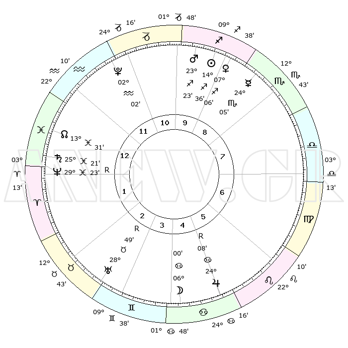 | | ΘΕΣΕΙΣ ΠΛΑΝΗΤΩΝ ΑΣΤΡΟΛΟΓΙΚΟΥ ΧΑΡΤΗ ΤΗΣ ΣΤΙΓΜΗΣ ΑΥΤΗΣ | | | | Πλανήτης | Ζώδιο | Μοίρες | Δεκαήμ. | Σε οίκο | Απόκλιση | | Ακμές των οίκων | | Ηλιος | Τοξότης | 14°31' | Δεύτερο | 10 | 22 S 32 | | 1ος | 17°54' | Υδροχόος | | Σελήνη | Καρκίνος | 04°47' | Πρώτο | 5 | 28 N 00 | | 2ος | 03°42' | Κριός | | Ερμής | Σκορπιός | 24°01' | Τρίτο | 9 | 16 S 24 | | 3ος | 08°50' | Ταύρος | | Αφροδίτη | Τοξότης | 06°60' | Πρώτο | 10 | 20 S 59 | | 4ος | 04°36' | Δίδυμοι | | Αρης | Τοξότης | 23°19' | Τρίτο | 10 | 23 S 58 | | 5ος | 26°28' | Δίδυμοι | | Δίας | Καρκίνος | 24°09'R | Τρίτο | 6 | 21 N 27 | | 6ος | 18°56' | Καρκίνος | | Κρόνος | Ιχθείς | 25°20' | Τρίτο | 1 | 04 S 00 | | 7ος | 17°54' | Λέων | | Ουρανός | Ταύρος | 28°50'R | Τρίτο | 3 | 19 N 42 | | 8ος | 03°42' | Ζυγός | | Ποσειδώνας | Ιχθείς | 29°23'R | Τρίτο | 1 | 01 S 29 | | 9ος | 08°50' | Σκορπιός | | Πλούτωνας | Υδροχόος | 02°02' | Πρώτο | 12 | 23 S 22 | | 10ος | 04°36' | Τοξότης | | Β. Δεσμός | Ιχθείς | 13°31' | Δεύτερο | 1 | 06 S 29 | | 11ος | 26°28' | Τοξότης | | Ωροσκόπος | Υδροχόος | 17°54' | Δεύτερο | | | 12ος | 18°56' | Αιγόκερως | | Μεσουράνημα | Τοξότης | 04°36' | Πρώτο | | | |