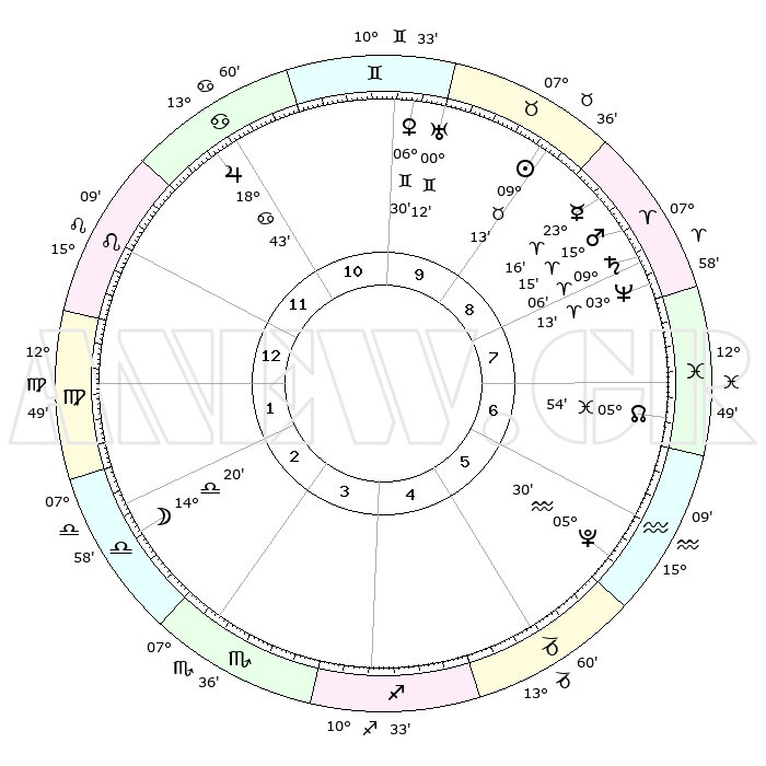 | | ΘΕΣΕΙΣ ΠΛΑΝΗΤΩΝ ΑΣΤΡΟΛΟΓΙΚΟΥ ΧΑΡΤΗ ΤΗΣ ΣΤΙΓΜΗΣ ΑΥΤΗΣ | | | | Πλανήτης | Ζώδιο | Μοίρες | Δεκαήμ. | Σε οίκο | Απόκλιση | | Ακμές των οίκων | | Ηλιος | Ταύρος | 09°10' | Πρώτο | 9 | 14 N 33 | | 1ος | 00°14' | Παρθένος | | Σελήνη | Ζυγός | 13°48' | Δεύτερο | 2 | 08 S 14 | | 2ος | 24°07' | Παρθένος | | Ερμής | Κριός | 23°11' | Τρίτο | 9 | 07 N 04 | | 3ος | 22°49' | Ζυγός | | Αφροδίτη | Δίδυμοι | 06°27' | Πρώτο | 10 | 22 N 12 | | 4ος | 25°44' | Σκορπιός | | Αρης | Κριός | 15°13' | Δεύτερο | 8 | 05 N 10 | | 5ος | 29°54' | Τοξότης | | Δίας | Καρκίνος | 18°42' | Δεύτερο | 11 | 22 N 31 | | 6ος | 01°50' | Υδροχόος | | Κρόνος | Κριός | 09°05' | Πρώτο | 8 | 01 N 36 | | 7ος | 00°14' | Ιχθείς | | Ουρανός | Δίδυμοι | 00°12' | Πρώτο | 10 | 20 N 01 | | 8ος | 24°07' | Ιχθείς | | Ποσειδώνας | Κριός | 03°13' | Πρώτο | 8 | 00 N 04 | | 9ος | 22°49' | Κριός | | Πλούτωνας | Υδροχόος | 05°30' | Πρώτο | 6 | 22 S 49 | | 10ος | 25°44' | Ταύρος | | Β. Δεσμός | Ιχθείς | 05°54' | Πρώτο | 7 | 09 S 21 | | 11ος | 29°54' | Δίδυμοι | | Ωροσκόπος | Παρθένος | 00°14' | Πρώτο | | | 12ος | 01°50' | Λέων | | Μεσουράνημα | Ταύρος | 25°44' | Τρίτο | | | |