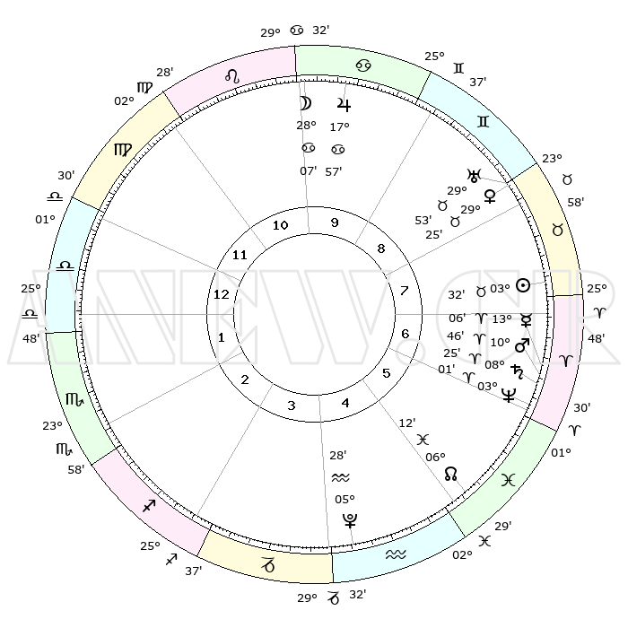 | | ΘΕΣΕΙΣ ΠΛΑΝΗΤΩΝ ΑΣΤΡΟΛΟΓΙΚΟΥ ΧΑΡΤΗ ΤΗΣ ΣΤΙΓΜΗΣ ΑΥΤΗΣ | | | | Πλανήτης | Ζώδιο | Μοίρες | Δεκαήμ. | Σε οίκο | Απόκλιση | | Ακμές των οίκων | | Ηλιος | Ταύρος | 03°29' | Πρώτο | 7 | 12 N 40 | | 1ος | 10°32' | Ζυγός | | Σελήνη | Καρκίνος | 27°23' | Τρίτο | 10 | 23 N 54 | | 2ος | 07°49' | Σκορπιός | | Ερμής | Κριός | 13°01' | Δεύτερο | 7 | 02 N 50 | | 3ος | 08°39' | Τοξότης | | Αφροδίτη | Ταύρος | 29°21' | Τρίτο | 8 | 20 N 34 | | 4ος | 11°51' | Αιγόκερως | | Αρης | Κριός | 10°43' | Δεύτερο | 7 | 03 N 23 | | 5ος | 14°47' | Υδροχόος | | Δίας | Καρκίνος | 17°57' | Δεύτερο | 10 | 22 N 37 | | 6ος | 14°46' | Ιχθείς | | Κρόνος | Κριός | 08°25' | Πρώτο | 6 | 01 N 21 | | 7ος | 10°32' | Κριός | | Ουρανός | Ταύρος | 29°52' | Τρίτο | 8 | 19 N 57 | | 8ος | 07°49' | Ταύρος | | Ποσειδώνας | Κριός | 03°01' | Πρώτο | 6 | 00 S 00 | | 9ος | 08°39' | Δίδυμοι | | Πλούτωνας | Υδροχόος | 05°28' | Πρώτο | 4 | 22 S 48 | | 10ος | 11°51' | Καρκίνος | | Β. Δεσμός | Ιχθείς | 06°12' | Πρώτο | 5 | 09 S 14 | | 11ος | 14°47' | Λέων | | Ωροσκόπος | Ζυγός | 10°32' | Δεύτερο | | | 12ος | 14°46' | Παρθένος | | Μεσουράνημα | Καρκίνος | 11°51' | Δεύτερο | | | |