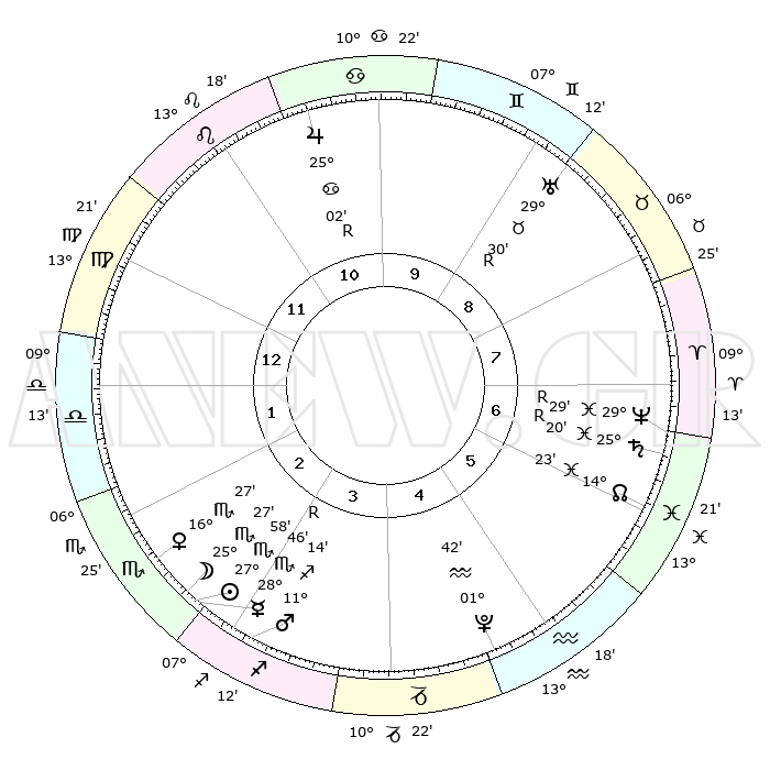 | | ΘΕΣΕΙΣ ΠΛΑΝΗΤΩΝ ΑΣΤΡΟΛΟΓΙΚΟΥ ΧΑΡΤΗ ΤΗΣ ΣΤΙΓΜΗΣ ΑΥΤΗΣ | | | | Πλανήτης | Ζώδιο | Μοίρες | Δεκαήμ. | Σε οίκο | Απόκλιση | | Ακμές των οίκων | | Ηλιος | Σκορπιός | 27°54' | Τρίτο | 3 | 19 S 41 | | 1ος | 22°25' | Παρθένος | | Σελήνη | Σκορπιός | 24°46' | Τρίτο | 3 | 23 S 30 | | 2ος | 18°25' | Ζυγός | | Ερμής | Σκορπιός | 28°51'R | Τρίτο | 3 | 19 S 30 | | 3ος | 18°32' | Σκορπιός | | Αφροδίτη | Σκορπιός | 16°23' | Δεύτερο | 2 | 15 S 42 | | 4ος | 21°28' | Τοξότης | | Αρης | Τοξότης | 11°12' | Δεύτερο | 3 | 22 S 41 | | 5ος | 24°35' | Αιγόκερως | | Δίας | Καρκίνος | 25°02'R | Τρίτο | 11 | 21 N 15 | | 6ος | 25°19' | Υδροχόος | | Κρόνος | Ιχθείς | 25°21'R | Τρίτο | 7 | 04 S 04 | | 7ος | 22°25' | Ιχθείς | | Ουρανός | Ταύρος | 29°30'R | Τρίτο | 9 | 19 N 50 | | 8ος | 18°25' | Κριός | | Ποσειδώνας | Ιχθείς | 29°29'R | Τρίτο | 7 | 01 S 27 | | 9ος | 18°32' | Ταύρος | | Πλούτωνας | Υδροχόος | 01°41' | Πρώτο | 5 | 23 S 27 | | 10ος | 21°28' | Δίδυμοι | | Β. Δεσμός | Ιχθείς | 14°24' | Δεύτερο | 6 | 06 S 08 | | 11ος | 24°35' | Καρκίνος | | Ωροσκόπος | Παρθένος | 22°25' | Τρίτο | | | 12ος | 25°19' | Λέων | | Μεσουράνημα | Δίδυμοι | 21°28' | Τρίτο | | | |