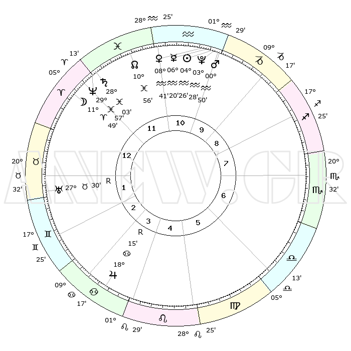 | | ΘΕΣΕΙΣ ΠΛΑΝΗΤΩΝ ΑΣΤΡΟΛΟΓΙΚΟΥ ΧΑΡΤΗ ΤΗΣ ΣΤΙΓΜΗΣ ΑΥΤΗΣ | | | | Πλανήτης | Ζώδιο | Μοίρες | Δεκαήμ. | Σε οίκο | Απόκλιση | | Ακμές των οίκων | | Ηλιος | Υδροχόος | 04°22' | Πρώτο | 11 | 19 S 10 | | 1ος | 15°15' | Κριός | | Σελήνη | Κριός | 10°54' | Δεύτερο | 12 | 06 N 49 | | 2ος | 21°34' | Ταύρος | | Ερμής | Υδροχόος | 06°13' | Πρώτο | 11 | 20 S 44 | | 3ος | 16°50' | Δίδυμοι | | Αφροδίτη | Υδροχόος | 08°36' | Πρώτο | 11 | 19 S 17 | | 4ος | 08°38' | Καρκίνος | | Αρης | Υδροχόος | 00°46' | Πρώτο | 10 | 20 S 58 | | 5ος | 01°48' | Λέων | | Δίας | Καρκίνος | 18°16'R | Δεύτερο | 4 | 22 N 29 | | 6ος | 01°44' | Παρθένος | | Κρόνος | Ιχθείς | 28°02' | Τρίτο | 12 | 02 S 48 | | 7ος | 15°15' | Ζυγός | | Ουρανός | Ταύρος | 27°30'R | Τρίτο | 2 | 19 N 25 | | 8ος | 21°34' | Σκορπιός | | Ποσειδώνας | Ιχθείς | 29°57' | Τρίτο | 12 | 01 S 14 | | 9ος | 16°50' | Τοξότης | | Πλούτωνας | Υδροχόος | 03°27' | Πρώτο | 11 | 23 S 04 | | 10ος | 08°38' | Αιγόκερως | | Β. Δεσμός | Ιχθείς | 10°56' | Δεύτερο | 12 | 07 S 28 | | 11ος | 01°48' | Υδροχόος | | Ωροσκόπος | Κριός | 15°15' | Δεύτερο | | | 12ος | 01°44' | Ιχθείς | | Μεσουράνημα | Αιγόκερως | 08°38' | Πρώτο | | | |