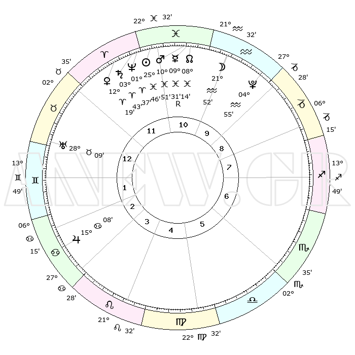 | | ΘΕΣΕΙΣ ΠΛΑΝΗΤΩΝ ΑΣΤΡΟΛΟΓΙΚΟΥ ΧΑΡΤΗ ΤΗΣ ΣΤΙΓΜΗΣ ΑΥΤΗΣ | | | | Πλανήτης | Ζώδιο | Μοίρες | Δεκαήμ. | Σε οίκο | Απόκλιση | | Ακμές των οίκων | | Ηλιος | Ιχθείς | 25°42' | Τρίτο | 11 | 01 S 43 | | 1ος | 16°07' | Ταύρος | | Σελήνη | Υδροχόος | 21°01' | Τρίτο | 10 | 16 S 02 | | 2ος | 14°04' | Δίδυμοι | | Ερμής | Ιχθείς | 09°33'R | Πρώτο | 11 | 06 S 02 | | 3ος | 06°14' | Καρκίνος | | Αφροδίτη | Κριός | 12°14' | Δεύτερο | 12 | 03 N 54 | | 4ος | 28°14' | Καρκίνος | | Αρης | Ιχθείς | 10°48' | Δεύτερο | 11 | 08 S 31 | | 5ος | 24°32' | Λέων | | Δίας | Καρκίνος | 15°08' | Δεύτερο | 3 | 22 N 56 | | 6ος | 00°29' | Ζυγός | | Κρόνος | Κριός | 03°42' | Πρώτο | 12 | 00 S 29 | | 7ος | 16°07' | Σκορπιός | | Ουρανός | Ταύρος | 28°09' | Τρίτο | 1 | 19 N 34 | | 8ος | 14°04' | Τοξότης | | Ποσειδώνας | Κριός | 01°37' | Πρώτο | 12 | 00 S 33 | | 9ος | 06°14' | Αιγόκερως | | Πλούτωνας | Υδροχόος | 04°55' | Πρώτο | 10 | 22 S 49 | | 10ος | 28°14' | Αιγόκερως | | Β. Δεσμός | Ιχθείς | 08°14' | Πρώτο | 11 | 08 S 29 | | 11ος | 24°32' | Υδροχόος | | Ωροσκόπος | Ταύρος | 16°07' | Δεύτερο | | | 12ος | 00°29' | Κριός | | Μεσουράνημα | Αιγόκερως | 28°14' | Τρίτο | | | |