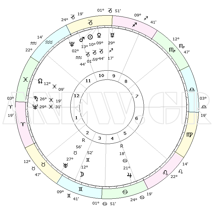 | | ΘΕΣΕΙΣ ΠΛΑΝΗΤΩΝ ΑΣΤΡΟΛΟΓΙΚΟΥ ΧΑΡΤΗ ΤΗΣ ΣΤΙΓΜΗΣ ΑΥΤΗΣ | | | | Πλανήτης | Ζώδιο | Μοίρες | Δεκαήμ. | Σε οίκο | Απόκλιση | | Ακμές των οίκων | | Ηλιος | Αιγόκερως | 10°55' | Δεύτερο | 11 | 22 S 59 | | 1ος | 20°25' | Υδροχόος | | Σελήνη | Δίδυμοι | 11°44' | Δεύτερο | 4 | 27 N 12 | | 2ος | 06°14' | Κριός | | Ερμής | Τοξότης | 29°10' | Τρίτο | 11 | 24 S 02 | | 3ος | 10°52' | Ταύρος | | Αφροδίτη | Αιγόκερως | 09°38' | Πρώτο | 11 | 23 S 36 | | 4ος | 06°19' | Δίδυμοι | | Αρης | Αιγόκερως | 12°57' | Δεύτερο | 11 | 23 S 41 | | 5ος | 28°08' | Δίδυμοι | | Δίας | Καρκίνος | 21°19'R | Τρίτο | 6 | 21 N 59 | | 6ος | 20°47' | Καρκίνος | | Κρόνος | Ιχθείς | 26°18' | Τρίτο | 1 | 03 S 32 | | 7ος | 20°25' | Λέων | | Ουρανός | Ταύρος | 27°56'R | Τρίτο | 3 | 19 N 30 | | 8ος | 06°14' | Ζυγός | | Ποσειδώνας | Ιχθείς | 29°31' | Τρίτο | 1 | 01 S 25 | | 9ος | 10°52' | Σκορπιός | | Πλούτωνας | Υδροχόος | 02°44' | Πρώτο | 12 | 23 S 13 | | 10ος | 06°19' | Τοξότης | | Β. Δεσμός | Ιχθείς | 12°09' | Δεύτερο | 1 | 07 S 00 | | 11ος | 28°08' | Τοξότης | | Ωροσκόπος | Υδροχόος | 20°25' | Τρίτο | | | 12ος | 20°47' | Αιγόκερως | | Μεσουράνημα | Τοξότης | 06°19' | Πρώτο | | | |