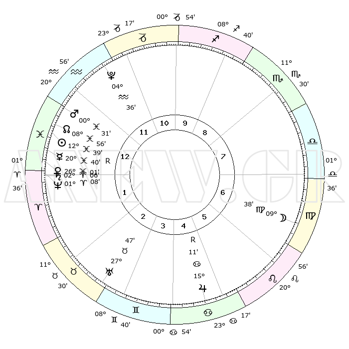 | | ΘΕΣΕΙΣ ΠΛΑΝΗΤΩΝ ΑΣΤΡΟΛΟΓΙΚΟΥ ΧΑΡΤΗ ΤΗΣ ΣΤΙΓΜΗΣ ΑΥΤΗΣ | | | | Πλανήτης | Ζώδιο | Μοίρες | Δεκαήμ. | Σε οίκο | Απόκλιση | | Ακμές των οίκων | | Ηλιος | Ιχθείς | 12°36' | Δεύτερο | 1 | 06 S 50 | | 1ος | 27°11' | Υδροχόος | | Σελήνη | Παρθένος | 08°49' | Πρώτο | 7 | 08 N 16 | | 2ος | 12°48' | Κριός | | Ερμής | Ιχθείς | 20°43'R | Τρίτο | 1 | 00 S 24 | | 3ος | 16°04' | Ταύρος | | Αφροδίτη | Ιχθείς | 25°56' | Τρίτο | 1 | 02 S 50 | | 4ος | 10°46' | Δίδυμοι | | Αρης | Ιχθείς | 00°28' | Πρώτο | 1 | 12 S 20 | | 5ος | 02°28' | Καρκίνος | | Δίας | Καρκίνος | 15°11'R | Δεύτερο | 5 | 22 N 55 | | 6ος | 25°45' | Καρκίνος | | Κρόνος | Κριός | 02°06' | Πρώτο | 1 | 01 S 07 | | 7ος | 27°11' | Λέων | | Ουρανός | Ταύρος | 27°47' | Τρίτο | 3 | 19 N 29 | | 8ος | 12°48' | Ζυγός | | Ποσειδώνας | Κριός | 01°08' | Πρώτο | 1 | 00 S 45 | | 9ος | 16°04' | Σκορπιός | | Πλούτωνας | Υδροχόος | 04°36' | Πρώτο | 12 | 22 S 52 | | 10ος | 10°46' | Τοξότης | | Β. Δεσμός | Ιχθείς | 08°56' | Πρώτο | 1 | 08 S 13 | | 11ος | 02°28' | Αιγόκερως | | Ωροσκόπος | Υδροχόος | 27°11' | Τρίτο | | | 12ος | 25°45' | Αιγόκερως | | Μεσουράνημα | Τοξότης | 10°46' | Δεύτερο | | | |