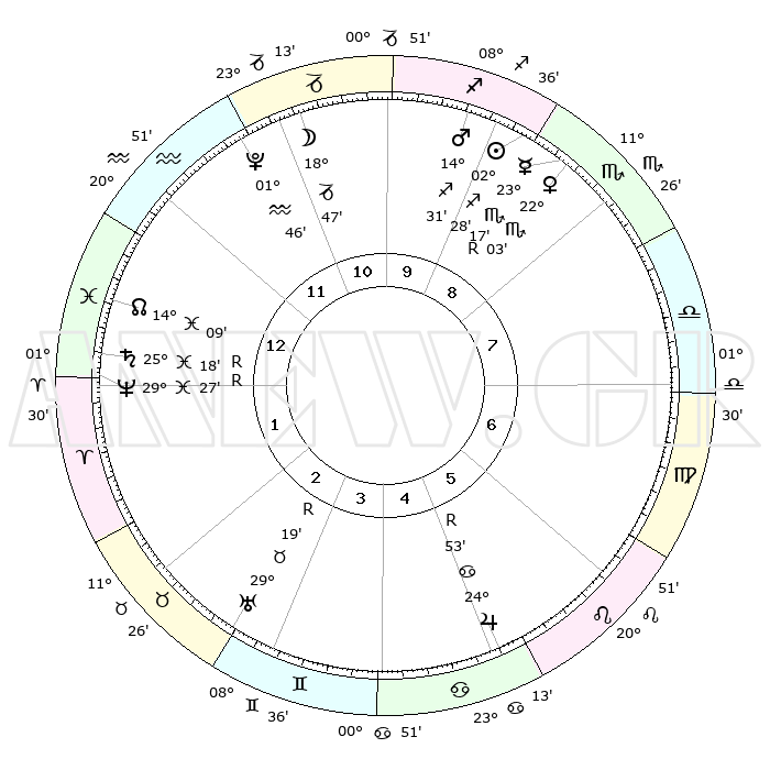 | | ΘΕΣΕΙΣ ΠΛΑΝΗΤΩΝ ΑΣΤΡΟΛΟΓΙΚΟΥ ΧΑΡΤΗ ΤΗΣ ΣΤΙΓΜΗΣ ΑΥΤΗΣ | | | | Πλανήτης | Ζώδιο | Μοίρες | Δεκαήμ. | Σε οίκο | Απόκλιση | | Ακμές των οίκων | | Ηλιος | Τοξότης | 02°25' | Πρώτο | 9 | 20 S 38 | | 1ος | 29°19' | Υδροχόος | | Σελήνη | Αιγόκερως | 18°06' | Δεύτερο | 11 | 26 S 21 | | 2ος | 14°47' | Κριός | | Ερμής | Σκορπιός | 23°20'R | Τρίτο | 9 | 16 S 54 | | 3ος | 17°38' | Ταύρος | | Αφροδίτη | Σκορπιός | 21°59' | Τρίτο | 9 | 17 S 22 | | 4ος | 12°06' | Δίδυμοι | | Αρης | Τοξότης | 14°28' | Δεύτερο | 10 | 23 S 08 | | 5ος | 03°48' | Καρκίνος | | Δίας | Καρκίνος | 24°53'R | Τρίτο | 5 | 21 N 17 | | 6ος | 27°17' | Καρκίνος | | Κρόνος | Ιχθείς | 25°18'R | Τρίτο | 1 | 04 S 04 | | 7ος | 29°19' | Λέων | | Ουρανός | Ταύρος | 29°19'R | Τρίτο | 3 | 19 N 48 | | 8ος | 14°47' | Ζυγός | | Ποσειδώνας | Ιχθείς | 29°27'R | Τρίτο | 1 | 01 S 28 | | 9ος | 17°38' | Σκορπιός | | Πλούτωνας | Υδροχόος | 01°46' | Πρώτο | 12 | 23 S 26 | | 10ος | 12°06' | Τοξότης | | Β. Δεσμός | Ιχθείς | 14°09' | Δεύτερο | 1 | 06 S 14 | | 11ος | 03°48' | Αιγόκερως | | Ωροσκόπος | Υδροχόος | 29°19' | Τρίτο | | | 12ος | 27°17' | Αιγόκερως | | Μεσουράνημα | Τοξότης | 12°06' | Δεύτερο | | | |