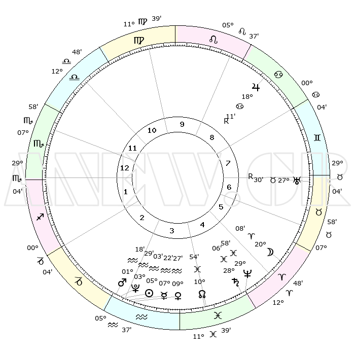 | | ΘΕΣΕΙΣ ΠΛΑΝΗΤΩΝ ΑΣΤΡΟΛΟΓΙΚΟΥ ΧΑΡΤΗ ΤΗΣ ΣΤΙΓΜΗΣ ΑΥΤΗΣ | | | | Πλανήτης | Ζώδιο | Μοίρες | Δεκαήμ. | Σε οίκο | Απόκλιση | | Ακμές των οίκων | | Ηλιος | Υδροχόος | 04°59' | Πρώτο | 3 | 19 S 01 | | 1ος | 07°43' | Σκορπιός | | Σελήνη | Κριός | 19°07' | Δεύτερο | 6 | 10 N 34 | | 2ος | 06°38' | Τοξότης | | Ερμής | Υδροχόος | 07°14' | Πρώτο | 3 | 20 S 29 | | 3ος | 09°17' | Αιγόκερως | | Αφροδίτη | Υδροχόος | 09°22' | Πρώτο | 3 | 19 S 06 | | 4ος | 14°02' | Υδροχόος | | Αρης | Υδροχόος | 01°15' | Πρώτο | 3 | 20 S 52 | | 5ος | 16°47' | Ιχθείς | | Δίας | Καρκίνος | 18°11'R | Δεύτερο | 9 | 22 N 29 | | 6ος | 14°41' | Κριός | | Κρόνος | Ιχθείς | 28°05' | Τρίτο | 5 | 02 S 46 | | 7ος | 07°43' | Ταύρος | | Ουρανός | Ταύρος | 27°30'R | Τρίτο | 7 | 19 N 25 | | 8ος | 06°38' | Δίδυμοι | | Ποσειδώνας | Ιχθείς | 29°58' | Τρίτο | 5 | 01 S 14 | | 9ος | 09°17' | Καρκίνος | | Πλούτωνας | Υδροχόος | 03°29' | Πρώτο | 3 | 23 S 04 | | 10ος | 14°02' | Λέων | | Β. Δεσμός | Ιχθείς | 10°54' | Δεύτερο | 4 | 07 S 29 | | 11ος | 16°47' | Παρθένος | | Ωροσκόπος | Σκορπιός | 07°43' | Πρώτο | | | 12ος | 14°41' | Ζυγός | | Μεσουράνημα | Λέων | 14°02' | Δεύτερο | | | |