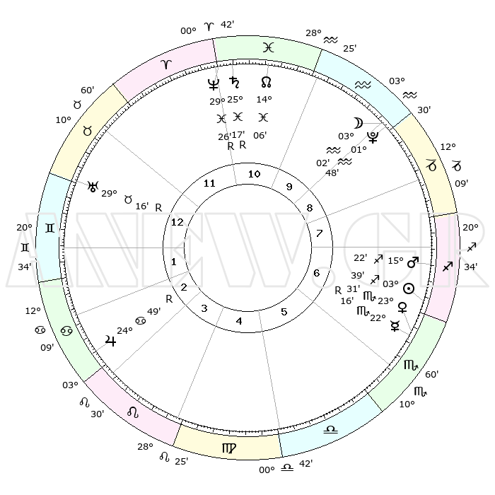 | | ΘΕΣΕΙΣ ΠΛΑΝΗΤΩΝ ΑΣΤΡΟΛΟΓΙΚΟΥ ΧΑΡΤΗ ΤΗΣ ΣΤΙΓΜΗΣ ΑΥΤΗΣ | | | | Πλανήτης | Ζώδιο | Μοίρες | Δεκαήμ. | Σε οίκο | Απόκλιση | | Ακμές των οίκων | | Ηλιος | Τοξότης | 03°34' | Πρώτο | 7 | 20 S 52 | | 1ος | 21°50' | Ταύρος | | Σελήνη | Υδροχόος | 02°09' | Πρώτο | 9 | 22 S 58 | | 2ος | 18°25' | Δίδυμοι | | Ερμής | Σκορπιός | 22°19'R | Τρίτο | 7 | 16 S 24 | | 3ος | 10°13' | Καρκίνος | | Αφροδίτη | Σκορπιός | 23°25' | Τρίτο | 7 | 17 S 46 | | 4ος | 02°28' | Λέων | | Αρης | Τοξότης | 15°19' | Δεύτερο | 7 | 23 S 14 | | 5ος | 29°36' | Λέων | | Δίας | Καρκίνος | 24°50'R | Τρίτο | 3 | 21 N 18 | | 6ος | 06°39' | Ζυγός | | Κρόνος | Ιχθείς | 25°17'R | Τρίτο | 11 | 04 S 04 | | 7ος | 21°50' | Σκορπιός | | Ουρανός | Ταύρος | 29°16'R | Τρίτο | 1 | 19 N 47 | | 8ος | 18°25' | Τοξότης | | Ποσειδώνας | Ιχθείς | 29°26'R | Τρίτο | 11 | 01 S 28 | | 9ος | 10°13' | Αιγόκερως | | Πλούτωνας | Υδροχόος | 01°48' | Πρώτο | 9 | 23 S 26 | | 10ος | 02°28' | Υδροχόος | | Β. Δεσμός | Ιχθείς | 14°06' | Δεύτερο | 11 | 06 S 15 | | 11ος | 29°36' | Υδροχόος | | Ωροσκόπος | Ταύρος | 21°50' | Τρίτο | | | 12ος | 06°39' | Κριός | | Μεσουράνημα | Υδροχόος | 02°28' | Πρώτο | | | |