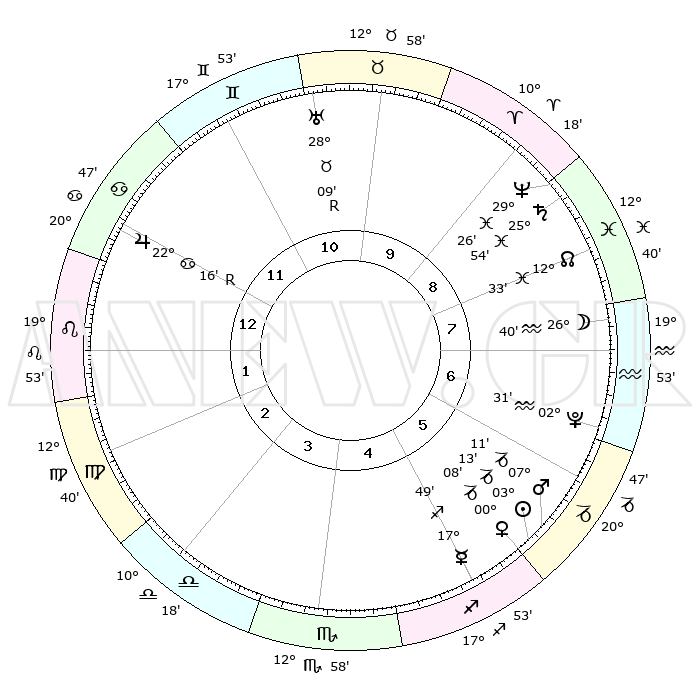 | | ΘΕΣΕΙΣ ΠΛΑΝΗΤΩΝ ΑΣΤΡΟΛΟΓΙΚΟΥ ΧΑΡΤΗ ΤΗΣ ΣΤΙΓΜΗΣ ΑΥΤΗΣ | | | | Πλανήτης | Ζώδιο | Μοίρες | Δεκαήμ. | Σε οίκο | Απόκλιση | | Ακμές των οίκων | | Ηλιος | Αιγόκερως | 03°08' | Πρώτο | 6 | 23 S 24 | | 1ος | 26°40' | Καρκίνος | | Σελήνη | Υδροχόος | 25°39' | Τρίτο | 8 | 14 S 15 | | 2ος | 17°30' | Λέων | | Ερμής | Τοξότης | 17°42' | Δεύτερο | 5 | 22 S 34 | | 3ος | 12°06' | Παρθένος | | Αφροδίτη | Αιγόκερως | 00°02' | Πρώτο | 6 | 23 S 39 | | 4ος | 12°42' | Ζυγός | | Αρης | Αιγόκερως | 07°08' | Πρώτο | 6 | 24 S 05 | | 5ος | 18°48' | Σκορπιός | | Δίας | Καρκίνος | 22°16'R | Τρίτο | 12 | 21 N 49 | | 6ος | 25°03' | Τοξότης | | Κρόνος | Ιχθείς | 25°54' | Τρίτο | 9 | 03 S 44 | | 7ος | 26°40' | Αιγόκερως | | Ουρανός | Ταύρος | 28°10'R | Τρίτο | 11 | 19 N 33 | | 8ος | 17°30' | Υδροχόος | | Ποσειδώνας | Ιχθείς | 29°26' | Τρίτο | 9 | 01 S 27 | | 9ος | 12°06' | Ιχθείς | | Πλούτωνας | Υδροχόος | 02°30' | Πρώτο | 7 | 23 S 16 | | 10ος | 12°42' | Κριός | | Β. Δεσμός | Ιχθείς | 12°33' | Δεύτερο | 9 | 06 S 51 | | 11ος | 18°48' | Ταύρος | | Ωροσκόπος | Καρκίνος | 26°40' | Τρίτο | | | 12ος | 25°03' | Δίδυμοι | | Μεσουράνημα | Κριός | 12°42' | Δεύτερο | | | |