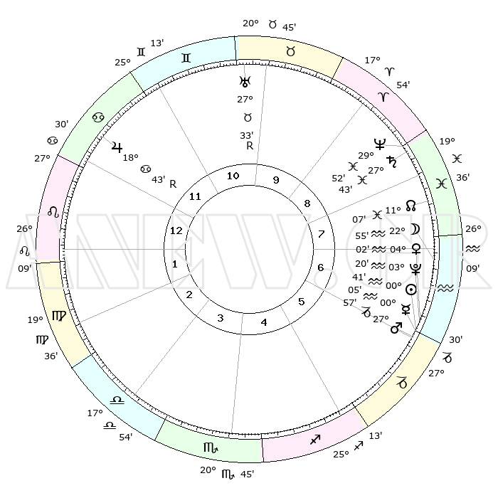 | | ΘΕΣΕΙΣ ΠΛΑΝΗΤΩΝ ΑΣΤΡΟΛΟΓΙΚΟΥ ΧΑΡΤΗ ΤΗΣ ΣΤΙΓΜΗΣ ΑΥΤΗΣ | | | | Πλανήτης | Ζώδιο | Μοίρες | Δεκαήμ. | Σε οίκο | Απόκλιση | | Ακμές των οίκων | | Ηλιος | Υδροχόος | 00°35' | Πρώτο | 6 | 20 S 01 | | 1ος | 00°59' | Λέων | | Σελήνη | Υδροχόος | 21°48' | Τρίτο | 7 | 15 S 43 | | 2ος | 22°05' | Λέων | | Ερμής | Αιγόκερως | 29°56' | Τρίτο | 6 | 22 S 09 | | 3ος | 17°16' | Παρθένος | | Αφροδίτη | Υδροχόος | 03°56' | Πρώτο | 7 | 20 S 22 | | 4ος | 18°25' | Ζυγός | | Αρης | Αιγόκερως | 27°53' | Τρίτο | 6 | 21 S 33 | | 5ος | 24°26' | Σκορπιός | | Δίας | Καρκίνος | 18°44'R | Δεύτερο | 12 | 22 N 24 | | 6ος | 29°59' | Τοξότης | | Κρόνος | Ιχθείς | 27°43' | Τρίτο | 9 | 02 S 56 | | 7ος | 00°59' | Υδροχόος | | Ουρανός | Ταύρος | 27°33'R | Τρίτο | 11 | 19 N 25 | | 8ος | 22°05' | Υδροχόος | | Ποσειδώνας | Ιχθείς | 29°51' | Τρίτο | 9 | 01 S 16 | | 9ος | 17°16' | Ιχθείς | | Πλούτωνας | Υδροχόος | 03°20' | Πρώτο | 7 | 23 S 06 | | 10ος | 18°25' | Κριός | | Β. Δεσμός | Ιχθείς | 11°08' | Δεύτερο | 8 | 07 S 23 | | 11ος | 24°26' | Ταύρος | | Ωροσκόπος | Λέων | 00°59' | Πρώτο | | | 12ος | 29°59' | Δίδυμοι | | Μεσουράνημα | Κριός | 18°25' | Δεύτερο | | | |