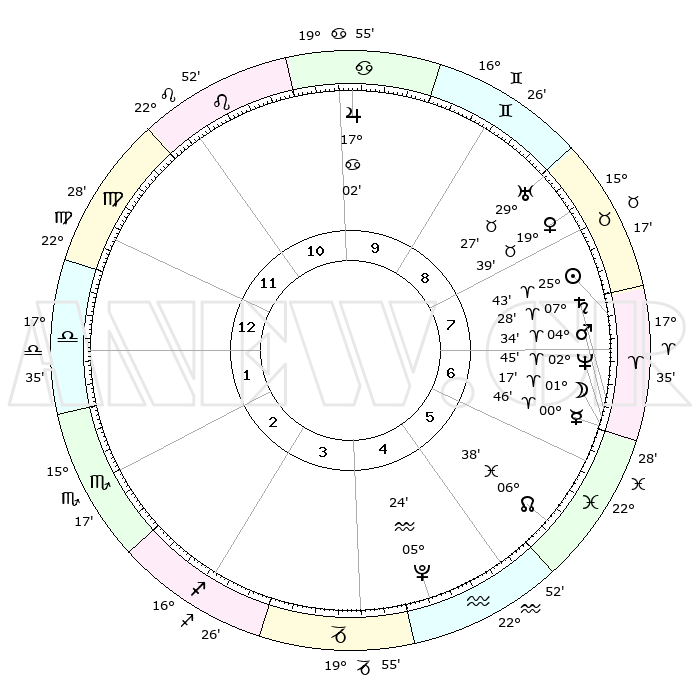 | | ΘΕΣΕΙΣ ΠΛΑΝΗΤΩΝ ΑΣΤΡΟΛΟΓΙΚΟΥ ΧΑΡΤΗ ΤΗΣ ΣΤΙΓΜΗΣ ΑΥΤΗΣ | | | | Πλανήτης | Ζώδιο | Μοίρες | Δεκαήμ. | Σε οίκο | Απόκλιση | | Ακμές των οίκων | | Ηλιος | Κριός | 25°39' | Τρίτο | 8 | 09 N 55 | | 1ος | 26°30' | Παρθένος | | Σελήνη | Κριός | 00°17' | Πρώτο | 7 | 01 N 54 | | 2ος | 22°50' | Ζυγός | | Ερμής | Κριός | 00°40' | Πρώτο | 7 | 02 S 08 | | 3ος | 23°08' | Σκορπιός | | Αφροδίτη | Ταύρος | 19°34' | Δεύτερο | 8 | 17 N 49 | | 4ος | 26°05' | Τοξότης | | Αρης | Κριός | 04°31' | Πρώτο | 7 | 00 N 54 | | 5ος | 29°06' | Αιγόκερως | | Δίας | Καρκίνος | 17°02' | Δεύτερο | 10 | 22 N 44 | | 6ος | 29°40' | Υδροχόος | | Κρόνος | Κριός | 07°27' | Πρώτο | 7 | 00 N 59 | | 7ος | 26°30' | Ιχθείς | | Ουρανός | Ταύρος | 29°27' | Τρίτο | 9 | 19 N 52 | | 8ος | 22°50' | Κριός | | Ποσειδώνας | Κριός | 02°45' | Πρώτο | 7 | 00 S 07 | | 9ος | 23°08' | Ταύρος | | Πλούτωνας | Υδροχόος | 05°24' | Πρώτο | 5 | 22 S 47 | | 10ος | 26°05' | Δίδυμοι | | Β. Δεσμός | Ιχθείς | 06°38' | Πρώτο | 6 | 09 S 05 | | 11ος | 29°06' | Καρκίνος | | Ωροσκόπος | Παρθένος | 26°30' | Τρίτο | | | 12ος | 29°40' | Λέων | | Μεσουράνημα | Δίδυμοι | 26°05' | Τρίτο | | | |