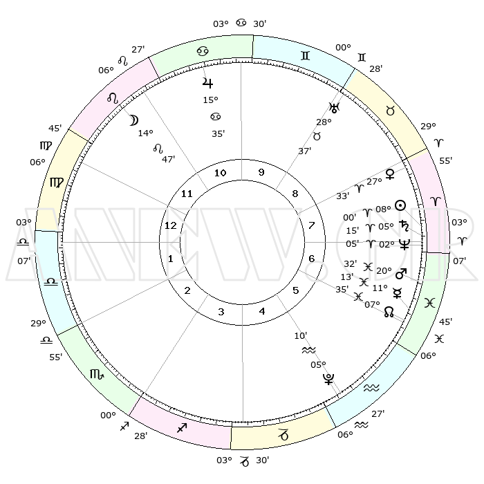 | | ΘΕΣΕΙΣ ΠΛΑΝΗΤΩΝ ΑΣΤΡΟΛΟΓΙΚΟΥ ΧΑΡΤΗ ΤΗΣ ΣΤΙΓΜΗΣ ΑΥΤΗΣ | | | | Πλανήτης | Ζώδιο | Μοίρες | Δεκαήμ. | Σε οίκο | Απόκλιση | | Ακμές των οίκων | | Ηλιος | Κριός | 07°56' | Πρώτο | 7 | 03 N 09 | | 1ος | 13°04' | Παρθένος | | Σελήνη | Λέων | 13°52' | Δεύτερο | 11 | 18 N 46 | | 2ος | 08°14' | Ζυγός | | Ερμής | Ιχθείς | 11°10' | Δεύτερο | 6 | 08 S 03 | | 3ος | 07°53' | Σκορπιός | | Αφροδίτη | Κριός | 27°28' | Τρίτο | 8 | 10 N 02 | | 4ος | 10°49' | Τοξότης | | Αρης | Ιχθείς | 20°28' | Τρίτο | 7 | 04 S 45 | | 5ος | 14°16' | Αιγόκερως | | Δίας | Καρκίνος | 15°35' | Δεύτερο | 11 | 22 N 53 | | 6ος | 15°24' | Υδροχόος | | Κρόνος | Κριός | 05°14' | Πρώτο | 7 | 00 N 08 | | 7ος | 13°04' | Ιχθείς | | Ουρανός | Ταύρος | 28°37' | Τρίτο | 9 | 19 N 41 | | 8ος | 08°14' | Κριός | | Ποσειδώνας | Κριός | 02°05' | Πρώτο | 7 | 00 S 22 | | 9ος | 07°53' | Ταύρος | | Πλούτωνας | Υδροχόος | 05°10' | Πρώτο | 5 | 22 S 48 | | 10ος | 10°49' | Δίδυμοι | | Β. Δεσμός | Ιχθείς | 07°35' | Πρώτο | 6 | 08 S 43 | | 11ος | 14°16' | Καρκίνος | | Ωροσκόπος | Παρθένος | 13°04' | Δεύτερο | | | 12ος | 15°24' | Λέων | | Μεσουράνημα | Δίδυμοι | 10°49' | Δεύτερο | | | |