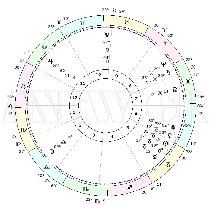 | | ΘΕΣΕΙΣ ΠΛΑΝΗΤΩΝ ΑΣΤΡΟΛΟΓΙΚΟΥ ΧΑΡΤΗ ΤΗΣ ΣΤΙΓΜΗΣ ΑΥΤΗΣ | | | | Πλανήτης | Ζώδιο | Μοίρες | Δεκαήμ. | Σε οίκο | Απόκλιση | | Ακμές των οίκων | | Ηλιος | Αιγόκερως | 18°46' | Δεύτερο | 3 | 22 S 07 | | 1ος | 15°23' | Σκορπιός | | Σελήνη | Ζυγός | 00°27' | Πρώτο | 11 | 01 S 48 | | 2ος | 14°53' | Τοξότης | | Ερμής | Αιγόκερως | 11°07' | Δεύτερο | 2 | 24 S 19 | | 3ος | 18°25' | Αιγόκερως | | Αφροδίτη | Αιγόκερως | 19°20' | Δεύτερο | 3 | 22 S 49 | | 4ος | 23°43' | Υδροχόος | | Αρης | Αιγόκερως | 18°53' | Δεύτερο | 3 | 23 S 02 | | 5ος | 26°07' | Ιχθείς | | Δίας | Καρκίνος | 20°17'R | Τρίτο | 9 | 22 N 09 | | 6ος | 23°07' | Κριός | | Κρόνος | Ιχθείς | 26°48' | Τρίτο | 5 | 03 S 19 | | 7ος | 15°23' | Ταύρος | | Ουρανός | Ταύρος | 27°45'R | Τρίτο | 7 | 19 N 28 | | 8ος | 14°53' | Δίδυμοι | | Ποσειδώνας | Ιχθείς | 29°38' | Τρίτο | 5 | 01 S 22 | | 9ος | 18°25' | Καρκίνος | | Πλούτωνας | Υδροχόος | 02°58' | Πρώτο | 3 | 23 S 10 | | 10ος | 23°43' | Λέων | | Β. Δεσμός | Ιχθείς | 11°45' | Δεύτερο | 4 | 07 S 09 | | 11ος | 26°07' | Παρθένος | | Ωροσκόπος | Σκορπιός | 15°23' | Δεύτερο | | | 12ος | 23°07' | Ζυγός | | Μεσουράνημα | Λέων | 23°43' | Τρίτο | | | |