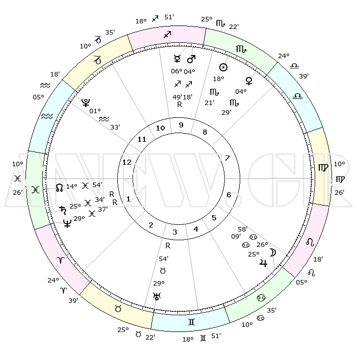 | | ΘΕΣΕΙΣ ΠΛΑΝΗΤΩΝ ΑΣΤΡΟΛΟΓΙΚΟΥ ΧΑΡΤΗ ΤΗΣ ΣΤΙΓΜΗΣ ΑΥΤΗΣ | | | | Πλανήτης | Ζώδιο | Μοίρες | Δεκαήμ. | Σε οίκο | Απόκλιση | | Ακμές των οίκων | | Ηλιος | Σκορπιός | 18°17' | Δεύτερο | 9 | 17 S 16 | | 1ος | 01°45' | Υδροχόος | | Σελήνη | Καρκίνος | 25°54' | Τρίτο | 6 | 24 N 48 | | 2ος | 16°07' | Ιχθείς | | Ερμής | Τοξότης | 06°50'R | Πρώτο | 10 | 23 S 40 | | 3ος | 24°17' | Κριός | | Αφροδίτη | Σκορπιός | 04°23' | Πρώτο | 9 | 11 S 44 | | 4ος | 22°27' | Ταύρος | | Αρης | Τοξότης | 04°15' | Πρώτο | 10 | 21 S 28 | | 5ος | 15°05' | Δίδυμοι | | Δίας | Καρκίνος | 25°09' | Τρίτο | 6 | 21 N 12 | | 6ος | 06°35' | Καρκίνος | | Κρόνος | Ιχθείς | 25°34'R | Τρίτο | 2 | 04 S 00 | | 7ος | 01°45' | Λέων | | Ουρανός | Ταύρος | 29°54'R | Τρίτο | 4 | 19 N 55 | | 8ος | 16°07' | Παρθένος | | Ποσειδώνας | Ιχθείς | 29°37'R | Τρίτο | 2 | 01 S 24 | | 9ος | 24°17' | Ζυγός | | Πλούτωνας | Υδροχόος | 01°33' | Πρώτο | 12 | 23 S 29 | | 10ος | 22°27' | Σκορπιός | | Β. Δεσμός | Ιχθείς | 14°54' | Δεύτερο | 1 | 05 S 57 | | 11ος | 15°05' | Τοξότης | | Ωροσκόπος | Υδροχόος | 01°45' | Πρώτο | | | 12ος | 06°35' | Αιγόκερως | | Μεσουράνημα | Σκορπιός | 22°27' | Τρίτο | | | |