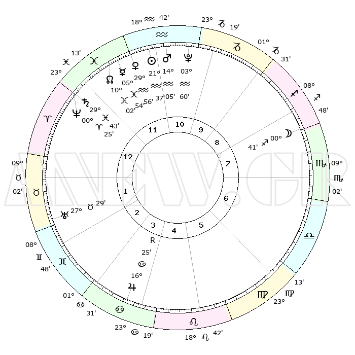 | | ΘΕΣΕΙΣ ΠΛΑΝΗΤΩΝ ΑΣΤΡΟΛΟΓΙΚΟΥ ΧΑΡΤΗ ΤΗΣ ΣΤΙΓΜΗΣ ΑΥΤΗΣ | | | | Πλανήτης | Ζώδιο | Μοίρες | Δεκαήμ. | Σε οίκο | Απόκλιση | | Ακμές των οίκων | | Ηλιος | Υδροχόος | 21°34' | Τρίτο | 11 | 14 S 19 | | 1ος | 08°44' | Κριός | | Σελήνη | Τοξότης | 00°02' | Πρώτο | 8 | 25 S 13 | | 2ος | 16°48' | Ταύρος | | Ερμής | Ιχθείς | 05°49' | Πρώτο | 12 | 10 S 10 | | 3ος | 12°56' | Δίδυμοι | | Αφροδίτη | Υδροχόος | 29°52' | Τρίτο | 12 | 12 S 53 | | 4ος | 04°55' | Καρκίνος | | Αρης | Υδροχόος | 14°02' | Δεύτερο | 11 | 17 S 38 | | 5ος | 27°40' | Καρκίνος | | Δίας | Καρκίνος | 16°25'R | Δεύτερο | 4 | 22 N 45 | | 6ος | 26°28' | Λέων | | Κρόνος | Ιχθείς | 29°43' | Τρίτο | 12 | 02 S 06 | | 7ος | 08°44' | Ζυγός | | Ουρανός | Ταύρος | 27°29' | Τρίτο | 2 | 19 N 25 | | 8ος | 16°48' | Σκορπιός | | Ποσειδώνας | Κριός | 00°25' | Πρώτο | 12 | 01 S 02 | | 9ος | 12°56' | Τοξότης | | Πλούτωνας | Υδροχόος | 03°60' | Πρώτο | 11 | 22 S 58 | | 10ος | 04°55' | Αιγόκερως | | Β. Δεσμός | Ιχθείς | 10°02' | Δεύτερο | 12 | 07 S 48 | | 11ος | 27°40' | Αιγόκερως | | Ωροσκόπος | Κριός | 08°44' | Πρώτο | | | 12ος | 26°28' | Υδροχόος | | Μεσουράνημα | Αιγόκερως | 04°55' | Πρώτο | | | |