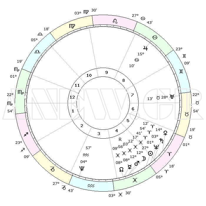 | | ΘΕΣΕΙΣ ΠΛΑΝΗΤΩΝ ΑΣΤΡΟΛΟΓΙΚΟΥ ΧΑΡΤΗ ΤΗΣ ΣΤΙΓΜΗΣ ΑΥΤΗΣ | | | | Πλανήτης | Ζώδιο | Μοίρες | Δεκαήμ. | Σε οίκο | Απόκλιση | | Ακμές των οίκων | | Ηλιος | Ιχθείς | 27°14' | Τρίτο | 5 | 01 S 06 | | 1ος | 06°00' | Σκορπιός | | Σελήνη | Ιχθείς | 11°25' | Δεύτερο | 4 | 07 S 05 | | 2ος | 04°48' | Τοξότης | | Ερμής | Ιχθείς | 08°57'R | Πρώτο | 4 | 06 S 37 | | 3ος | 07°17' | Αιγόκερως | | Αφροδίτη | Κριός | 14°08' | Δεύτερο | 6 | 04 N 41 | | 4ος | 11°54' | Υδροχόος | | Αρης | Ιχθείς | 12°00' | Δεύτερο | 4 | 08 S 03 | | 5ος | 14°42' | Ιχθείς | | Δίας | Καρκίνος | 15°09' | Δεύτερο | 9 | 22 N 56 | | 6ος | 12°47' | Κριός | | Κρόνος | Κριός | 03°54' | Πρώτο | 5 | 00 S 24 | | 7ος | 06°00' | Ταύρος | | Ουρανός | Ταύρος | 28°12' | Τρίτο | 7 | 19 N 35 | | 8ος | 04°48' | Δίδυμοι | | Ποσειδώνας | Κριός | 01°40' | Πρώτο | 5 | 00 S 32 | | 9ος | 07°17' | Καρκίνος | | Πλούτωνας | Υδροχόος | 04°57' | Πρώτο | 3 | 22 S 49 | | 10ος | 11°54' | Λέων | | Β. Δεσμός | Ιχθείς | 08°09' | Πρώτο | 4 | 08 S 31 | | 11ος | 14°42' | Παρθένος | | Ωροσκόπος | Σκορπιός | 06°00' | Πρώτο | | | 12ος | 12°47' | Ζυγός | | Μεσουράνημα | Λέων | 11°54' | Δεύτερο | | | |
