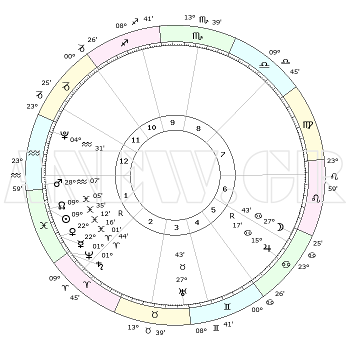 | | ΘΕΣΕΙΣ ΠΛΑΝΗΤΩΝ ΑΣΤΡΟΛΟΓΙΚΟΥ ΧΑΡΤΗ ΤΗΣ ΣΤΙΓΜΗΣ ΑΥΤΗΣ | | | | Πλανήτης | Ζώδιο | Μοίρες | Δεκαήμ. | Σε οίκο | Απόκλιση | | Ακμές των οίκων | | Ηλιος | Ιχθείς | 09°31' | Πρώτο | 2 | 08 S 00 | | 1ος | 22°57' | Αιγόκερως | | Σελήνη | Καρκίνος | 26°45' | Τρίτο | 7 | 24 N 17 | | 2ος | 05°43' | Ιχθείς | | Ερμής | Ιχθείς | 22°18'R | Τρίτο | 2 | 00 S 10 | | 3ος | 15°08' | Κριός | | Αφροδίτη | Ιχθείς | 22°07' | Τρίτο | 2 | 04 S 23 | | 4ος | 14°52' | Ταύρος | | Αρης | Υδροχόος | 28°03' | Τρίτο | 1 | 13 S 10 | | 5ος | 08°13' | Δίδυμοι | | Δίας | Καρκίνος | 15°17'R | Δεύτερο | 6 | 22 N 54 | | 6ος | 29°28' | Δίδυμοι | | Κρόνος | Κριός | 01°44' | Πρώτο | 2 | 01 S 16 | | 7ος | 22°57' | Καρκίνος | | Ουρανός | Ταύρος | 27°43' | Τρίτο | 4 | 19 N 28 | | 8ος | 05°43' | Παρθένος | | Ποσειδώνας | Κριός | 01°01' | Πρώτο | 2 | 00 S 48 | | 9ος | 15°08' | Ζυγός | | Πλούτωνας | Υδροχόος | 04°31' | Πρώτο | 1 | 22 S 53 | | 10ος | 14°52' | Σκορπιός | | Β. Δεσμός | Ιχθείς | 09°06' | Πρώτο | 2 | 08 S 10 | | 11ος | 08°13' | Τοξότης | | Ωροσκόπος | Αιγόκερως | 22°57' | Τρίτο | | | 12ος | 29°28' | Τοξότης | | Μεσουράνημα | Σκορπιός | 14°52' | Δεύτερο | | | |