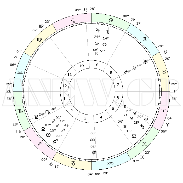 | | ΘΕΣΕΙΣ ΠΛΑΝΗΤΩΝ ΑΣΤΡΟΛΟΓΙΚΟΥ ΧΑΡΤΗ ΤΗΣ ΣΤΙΓΜΗΣ ΑΥΤΗΣ | | | | Πλανήτης | Ζώδιο | Μοίρες | Δεκαήμ. | Σε οίκο | Απόκλιση | | Ακμές των οίκων | | Ηλιος | Τοξότης | 15°10' | Δεύτερο | 2 | 22 S 36 | | 1ος | 17°57' | Ζυγός | | Σελήνη | Καρκίνος | 14°15' | Δεύτερο | 9 | 26 N 57 | | 2ος | 15°41' | Σκορπιός | | Ερμής | Σκορπιός | 24°36' | Τρίτο | 2 | 16 S 35 | | 3ος | 16°52' | Τοξότης | | Αφροδίτη | Τοξότης | 07°48' | Πρώτο | 2 | 21 S 08 | | 4ος | 20°21' | Αιγόκερως | | Αρης | Τοξότης | 23°48' | Τρίτο | 3 | 24 S 00 | | 5ος | 23°18' | Υδροχόος | | Δίας | Καρκίνος | 24°06'R | Τρίτο | 10 | 21 N 27 | | 6ος | 22°53' | Ιχθείς | | Κρόνος | Ιχθείς | 25°21' | Τρίτο | 6 | 04 S 00 | | 7ος | 17°57' | Κριός | | Ουρανός | Ταύρος | 28°48'R | Τρίτο | 8 | 19 N 41 | | 8ος | 15°41' | Ταύρος | | Ποσειδώνας | Ιχθείς | 29°23'R | Τρίτο | 6 | 01 S 29 | | 9ος | 16°52' | Δίδυμοι | | Πλούτωνας | Υδροχόος | 02°03' | Πρώτο | 4 | 23 S 22 | | 10ος | 20°21' | Καρκίνος | | Β. Δεσμός | Ιχθείς | 13°29' | Δεύτερο | 5 | 06 S 29 | | 11ος | 23°18' | Λέων | | Ωροσκόπος | Ζυγός | 17°57' | Δεύτερο | | | 12ος | 22°53' | Παρθένος | | Μεσουράνημα | Καρκίνος | 20°21' | Τρίτο | | | |
