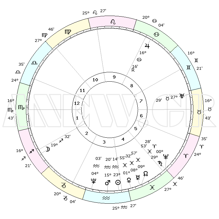 | | ΘΕΣΕΙΣ ΠΛΑΝΗΤΩΝ ΑΣΤΡΟΛΟΓΙΚΟΥ ΧΑΡΤΗ ΤΗΣ ΣΤΙΓΜΗΣ ΑΥΤΗΣ | | | | Πλανήτης | Ζώδιο | Μοίρες | Δεκαήμ. | Σε οίκο | Απόκλιση | | Ακμές των οίκων | | Ηλιος | Υδροχόος | 23°09' | Τρίτο | 4 | 13 S 48 | | 1ος | 26°34' | Ζυγός | | Σελήνη | Τοξότης | 18°42' | Δεύτερο | 2 | 28 S 07 | | 2ος | 24°47' | Σκορπιός | | Ερμής | Ιχθείς | 08°26' | Πρώτο | 5 | 08 S 57 | | 3ος | 26°29' | Τοξότης | | Αφροδίτη | Ιχθείς | 01°50' | Πρώτο | 4 | 12 S 11 | | 4ος | 00°27' | Υδροχόος | | Αρης | Υδροχόος | 15°16' | Δεύτερο | 4 | 17 S 17 | | 5ος | 03°24' | Ιχθείς | | Δίας | Καρκίνος | 16°17'R | Δεύτερο | 9 | 22 N 46 | | 6ος | 02°22' | Κριός | | Κρόνος | Ιχθείς | 29°53' | Τρίτο | 5 | 02 S 01 | | 7ος | 26°35' | Κριός | | Ουρανός | Ταύρος | 27°29' | Τρίτο | 8 | 19 N 25 | | 8ος | 24°47' | Ταύρος | | Ποσειδώνας | Κριός | 00°28' | Πρώτο | 5 | 01 S 01 | | 9ος | 26°29' | Δίδυμοι | | Πλούτωνας | Υδροχόος | 04°02' | Πρώτο | 4 | 22 S 58 | | 10ος | 00°27' | Λέων | | Β. Δεσμός | Ιχθείς | 09°57' | Πρώτο | 5 | 07 S 50 | | 11ος | 03°24' | Παρθένος | | Ωροσκόπος | Ζυγός | 26°34' | Τρίτο | | | 12ος | 02°22' | Ζυγός | | Μεσουράνημα | Λέων | 00°27' | Πρώτο | | | |