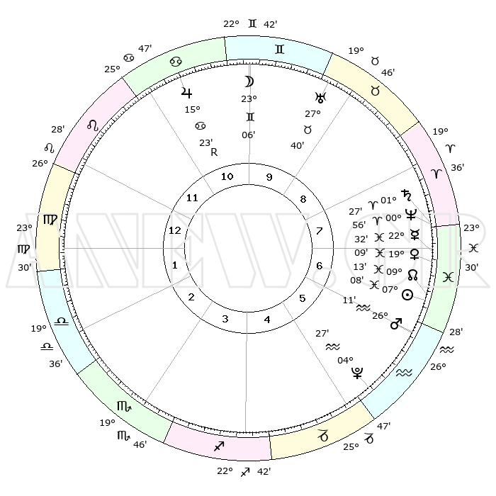 | | ΘΕΣΕΙΣ ΠΛΑΝΗΤΩΝ ΑΣΤΡΟΛΟΓΙΚΟΥ ΧΑΡΤΗ ΤΗΣ ΣΤΙΓΜΗΣ ΑΥΤΗΣ | | | | Πλανήτης | Ζώδιο | Μοίρες | Δεκαήμ. | Σε οίκο | Απόκλιση | | Ακμές των οίκων | | Ηλιος | Ιχθείς | 07°04' | Πρώτο | 7 | 08 S 55 | | 1ος | 05°34' | Παρθένος | | Σελήνη | Δίδυμοι | 22°14' | Τρίτο | 10 | 28 N 20 | | 2ος | 29°60' | Παρθένος | | Ερμής | Ιχθείς | 22°32' | Τρίτο | 7 | 00 S 31 | | 3ος | 29°08' | Ζυγός | | Αφροδίτη | Ιχθείς | 19°04' | Δεύτερο | 7 | 05 S 37 | | 4ος | 02°05' | Τοξότης | | Αρης | Υδροχόος | 26°08' | Τρίτο | 6 | 13 S 50 | | 5ος | 05°55' | Αιγόκερως | | Δίας | Καρκίνος | 15°23'R | Δεύτερο | 11 | 22 N 53 | | 6ος | 07°28' | Υδροχόος | | Κρόνος | Κριός | 01°27' | Πρώτο | 8 | 01 S 23 | | 7ος | 05°34' | Ιχθείς | | Ουρανός | Ταύρος | 27°40' | Τρίτο | 9 | 19 N 27 | | 8ος | 29°60' | Ιχθείς | | Ποσειδώνας | Κριός | 00°56' | Πρώτο | 8 | 00 S 50 | | 9ος | 29°08' | Κριός | | Πλούτωνας | Υδροχόος | 04°27' | Πρώτο | 5 | 22 S 53 | | 10ος | 02°05' | Δίδυμοι | | Β. Δεσμός | Ιχθείς | 09°13' | Πρώτο | 7 | 08 S 07 | | 11ος | 05°55' | Καρκίνος | | Ωροσκόπος | Παρθένος | 05°34' | Πρώτο | | | 12ος | 07°28' | Λέων | | Μεσουράνημα | Δίδυμοι | 02°05' | Πρώτο | | | |