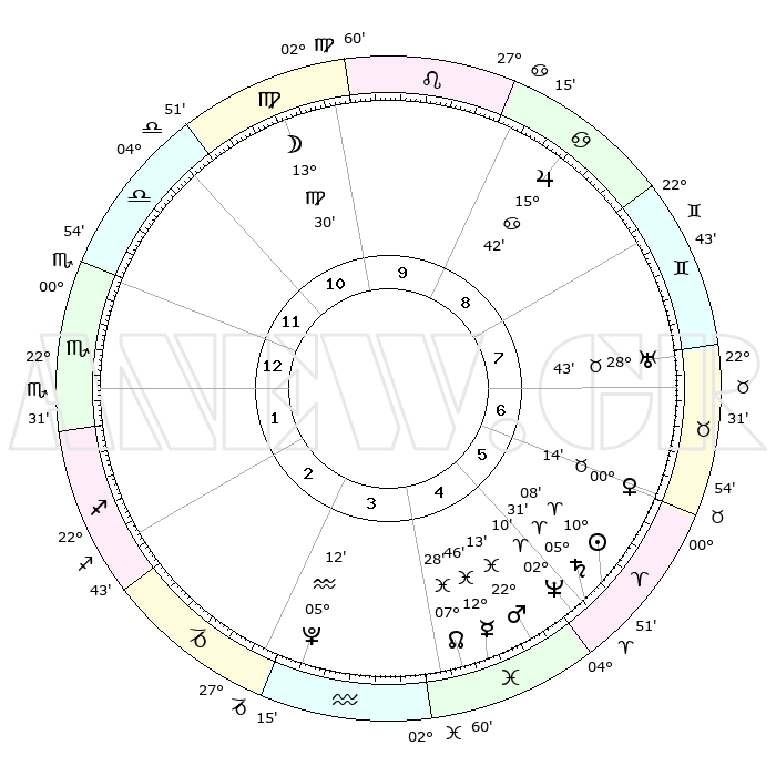 | | ΘΕΣΕΙΣ ΠΛΑΝΗΤΩΝ ΑΣΤΡΟΛΟΓΙΚΟΥ ΧΑΡΤΗ ΤΗΣ ΣΤΙΓΜΗΣ ΑΥΤΗΣ | | | | Πλανήτης | Ζώδιο | Μοίρες | Δεκαήμ. | Σε οίκο | Απόκλιση | | Ακμές των οίκων | | Ηλιος | Κριός | 10°05' | Δεύτερο | 5 | 03 N 59 | | 1ος | 04°37' | Σκορπιός | | Σελήνη | Παρθένος | 12°42' | Δεύτερο | 10 | 06 N 28 | | 2ος | 03°19' | Τοξότης | | Ερμής | Ιχθείς | 12°43' | Δεύτερο | 4 | 07 S 49 | | 3ος | 05°40' | Αιγόκερως | | Αφροδίτη | Ταύρος | 00°09' | Πρώτο | 6 | 11 N 04 | | 4ος | 10°11' | Υδροχόος | | Αρης | Ιχθείς | 22°10' | Τρίτο | 5 | 04 S 04 | | 5ος | 13°01' | Ιχθείς | | Δίας | Καρκίνος | 15°42' | Δεύτερο | 9 | 22 N 53 | | 6ος | 11°15' | Κριός | | Κρόνος | Κριός | 05°31' | Πρώτο | 5 | 00 N 14 | | 7ος | 04°37' | Ταύρος | | Ουρανός | Ταύρος | 28°43' | Τρίτο | 7 | 19 N 42 | | 8ος | 03°19' | Δίδυμοι | | Ποσειδώνας | Κριός | 02°10' | Πρώτο | 5 | 00 S 20 | | 9ος | 05°40' | Καρκίνος | | Πλούτωνας | Υδροχόος | 05°12' | Πρώτο | 3 | 22 S 47 | | 10ος | 10°11' | Λέων | | Β. Δεσμός | Ιχθείς | 07°28' | Πρώτο | 4 | 08 S 46 | | 11ος | 13°01' | Παρθένος | | Ωροσκόπος | Σκορπιός | 04°37' | Πρώτο | | | 12ος | 11°15' | Ζυγός | | Μεσουράνημα | Λέων | 10°11' | Δεύτερο | | | |