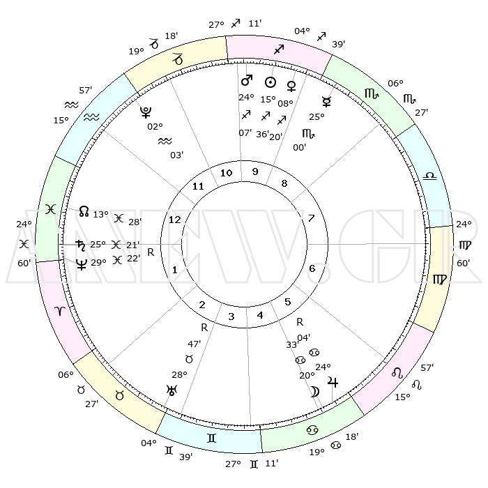 | | ΘΕΣΕΙΣ ΠΛΑΝΗΤΩΝ ΑΣΤΡΟΛΟΓΙΚΟΥ ΧΑΡΤΗ ΤΗΣ ΣΤΙΓΜΗΣ ΑΥΤΗΣ | | | | Πλανήτης | Ζώδιο | Μοίρες | Δεκαήμ. | Σε οίκο | Απόκλιση | | Ακμές των οίκων | | Ηλιος | Τοξότης | 15°23' | Δεύτερο | 12 | 22 S 38 | | 1ος | 23°29' | Τοξότης | | Σελήνη | Καρκίνος | 17°32' | Δεύτερο | 7 | 26 N 24 | | 2ος | 29°02' | Αιγόκερως | | Ερμής | Σκορπιός | 24°48' | Τρίτο | 11 | 16 S 39 | | 3ος | 08°25' | Ιχθείς | | Αφροδίτη | Τοξότης | 08°05' | Πρώτο | 12 | 21 S 11 | | 4ος | 13°18' | Κριός | | Αρης | Τοξότης | 23°58' | Τρίτο | 1 | 24 S 00 | | 5ος | 10°41' | Ταύρος | | Δίας | Καρκίνος | 24°05'R | Τρίτο | 7 | 21 N 28 | | 6ος | 02°59' | Δίδυμοι | | Κρόνος | Ιχθείς | 25°21' | Τρίτο | 3 | 04 S 00 | | 7ος | 23°29' | Δίδυμοι | | Ουρανός | Ταύρος | 28°48'R | Τρίτο | 5 | 19 N 41 | | 8ος | 29°02' | Καρκίνος | | Ποσειδώνας | Ιχθείς | 29°23'R | Τρίτο | 3 | 01 S 29 | | 9ος | 08°25' | Παρθένος | | Πλούτωνας | Υδροχόος | 02°03' | Πρώτο | 2 | 23 S 22 | | 10ος | 13°18' | Ζυγός | | Β. Δεσμός | Ιχθείς | 13°29' | Δεύτερο | 3 | 06 S 30 | | 11ος | 10°41' | Σκορπιός | | Ωροσκόπος | Τοξότης | 23°29' | Τρίτο | | | 12ος | 02°59' | Τοξότης | | Μεσουράνημα | Ζυγός | 13°18' | Δεύτερο | | | |