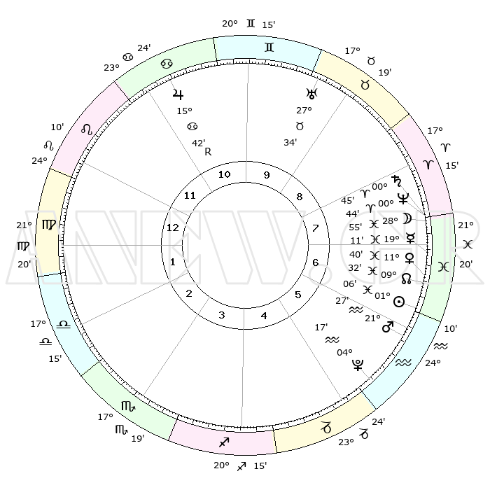 | | ΘΕΣΕΙΣ ΠΛΑΝΗΤΩΝ ΑΣΤΡΟΛΟΓΙΚΟΥ ΧΑΡΤΗ ΤΗΣ ΣΤΙΓΜΗΣ ΑΥΤΗΣ | | | | Πλανήτης | Ζώδιο | Μοίρες | Δεκαήμ. | Σε οίκο | Απόκλιση | | Ακμές των οίκων | | Ηλιος | Ιχθείς | 01°01' | Πρώτο | 7 | 11 S 07 | | 1ος | 28°58' | Λέων | | Σελήνη | Ιχθείς | 27°52' | Τρίτο | 8 | 00 N 44 | | 2ος | 22°43' | Παρθένος | | Ερμής | Ιχθείς | 19°06' | Δεύτερο | 7 | 03 S 14 | | 3ος | 21°17' | Ζυγός | | Αφροδίτη | Ιχθείς | 11°34' | Δεύτερο | 7 | 08 S 34 | | 4ος | 24°12' | Σκορπιός | | Αρης | Υδροχόος | 21°24' | Τρίτο | 6 | 15 S 24 | | 5ος | 28°27' | Τοξότης | | Δίας | Καρκίνος | 15°42'R | Δεύτερο | 11 | 22 N 50 | | 6ος | 00°29' | Υδροχόος | | Κρόνος | Κριός | 00°45' | Πρώτο | 8 | 01 S 40 | | 7ος | 28°58' | Υδροχόος | | Ουρανός | Ταύρος | 27°34' | Τρίτο | 10 | 19 N 26 | | 8ος | 22°43' | Ιχθείς | | Ποσειδώνας | Κριός | 00°43' | Πρώτο | 8 | 00 S 55 | | 9ος | 21°17' | Κριός | | Πλούτωνας | Υδροχόος | 04°16' | Πρώτο | 6 | 22 S 55 | | 10ος | 24°12' | Ταύρος | | Β. Δεσμός | Ιχθείς | 09°32' | Πρώτο | 7 | 07 S 59 | | 11ος | 28°27' | Δίδυμοι | | Ωροσκόπος | Λέων | 28°58' | Τρίτο | | | 12ος | 00°29' | Λέων | | Μεσουράνημα | Ταύρος | 24°12' | Τρίτο | | | |