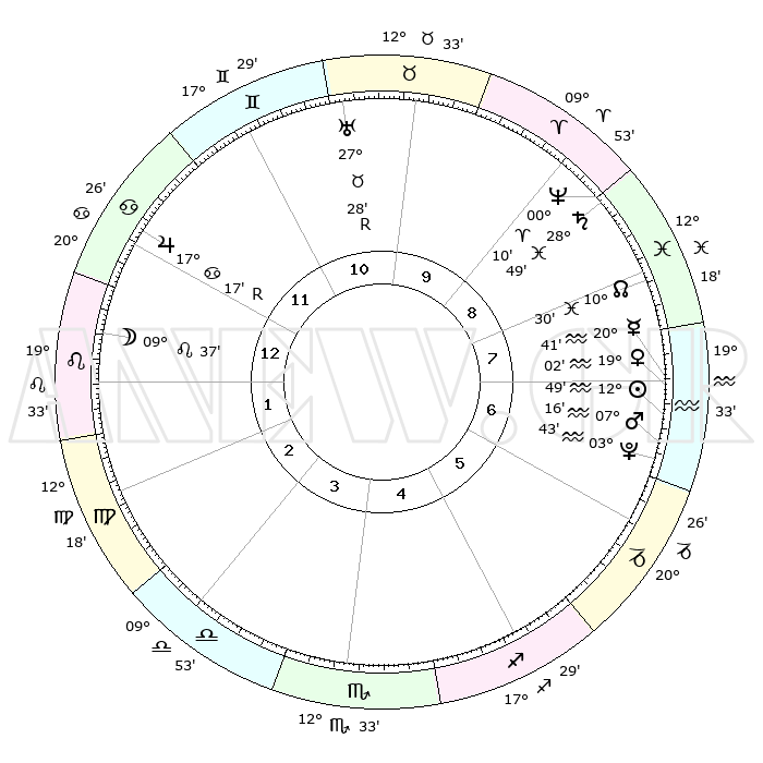 | | ΘΕΣΕΙΣ ΠΛΑΝΗΤΩΝ ΑΣΤΡΟΛΟΓΙΚΟΥ ΧΑΡΤΗ ΤΗΣ ΣΤΙΓΜΗΣ ΑΥΤΗΣ | | | | Πλανήτης | Ζώδιο | Μοίρες | Δεκαήμ. | Σε οίκο | Απόκλιση | | Ακμές των οίκων | | Ηλιος | Υδροχόος | 12°46' | Δεύτερο | 7 | 16 S 58 | | 1ος | 06°40' | Λέων | | Σελήνη | Λέων | 08°59' | Πρώτο | 1 | 20 N 32 | | 2ος | 28°13' | Λέων | | Ερμής | Υδροχόος | 20°37' | Τρίτο | 7 | 16 S 22 | | 3ος | 24°10' | Παρθένος | | Αφροδίτη | Υδροχόος | 18°59' | Δεύτερο | 7 | 16 S 26 | | 4ος | 25°56' | Ζυγός | | Αρης | Υδροχόος | 07°14' | Πρώτο | 7 | 19 S 28 | | 5ος | 01°44' | Τοξότης | | Δίας | Καρκίνος | 17°17'R | Δεύτερο | 12 | 22 N 37 | | 6ος | 06°23' | Αιγόκερως | | Κρόνος | Ιχθείς | 28°49' | Τρίτο | 9 | 02 S 28 | | 7ος | 06°40' | Υδροχόος | | Ουρανός | Ταύρος | 27°28'R | Τρίτο | 10 | 19 N 24 | | 8ος | 28°13' | Υδροχόος | | Ποσειδώνας | Κριός | 00°10' | Πρώτο | 9 | 01 S 09 | | 9ος | 24°10' | Ιχθείς | | Πλούτωνας | Υδροχόος | 03°43' | Πρώτο | 6 | 23 S 01 | | 10ος | 25°56' | Κριός | | Β. Δεσμός | Ιχθείς | 10°30' | Δεύτερο | 8 | 07 S 38 | | 11ος | 01°44' | Δίδυμοι | | Ωροσκόπος | Λέων | 06°40' | Πρώτο | | | 12ος | 06°23' | Καρκίνος | | Μεσουράνημα | Κριός | 25°56' | Τρίτο | | | |