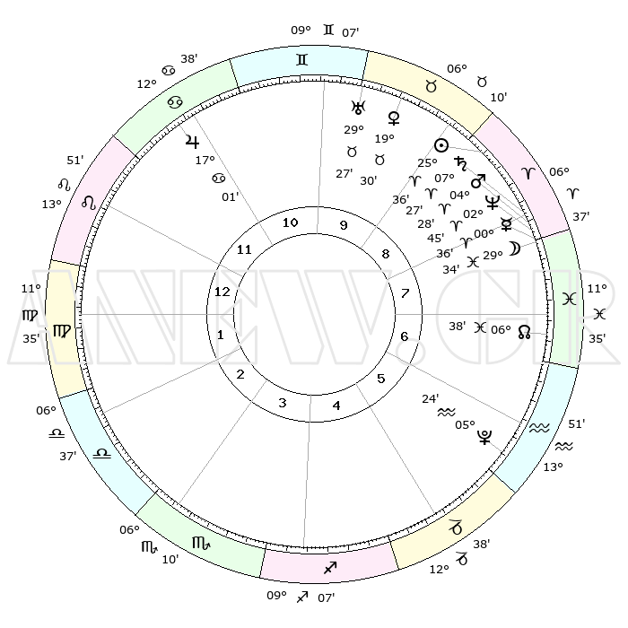 | | ΘΕΣΕΙΣ ΠΛΑΝΗΤΩΝ ΑΣΤΡΟΛΟΓΙΚΟΥ ΧΑΡΤΗ ΤΗΣ ΣΤΙΓΜΗΣ ΑΥΤΗΣ | | | | Πλανήτης | Ζώδιο | Μοίρες | Δεκαήμ. | Σε οίκο | Απόκλιση | | Ακμές των οίκων | | Ηλιος | Κριός | 25°31' | Τρίτο | 9 | 09 N 52 | | 1ος | 18°57' | Λέων | | Σελήνη | Ιχθείς | 28°29' | Τρίτο | 8 | 01 N 02 | | 2ος | 11°39' | Παρθένος | | Ερμής | Κριός | 00°29' | Πρώτο | 8 | 02 S 12 | | 3ος | 09°10' | Ζυγός | | Αφροδίτη | Ταύρος | 19°25' | Δεύτερο | 10 | 17 N 46 | | 4ος | 11°47' | Σκορπιός | | Αρης | Κριός | 04°25' | Πρώτο | 8 | 00 N 51 | | 5ος | 16°47' | Τοξότης | | Δίας | Καρκίνος | 17°01' | Δεύτερο | 11 | 22 N 44 | | 6ος | 19°47' | Αιγόκερως | | Κρόνος | Κριός | 07°27' | Πρώτο | 8 | 00 N 59 | | 7ος | 18°57' | Υδροχόος | | Ουρανός | Ταύρος | 29°27' | Τρίτο | 10 | 19 N 52 | | 8ος | 11°39' | Ιχθείς | | Ποσειδώνας | Κριός | 02°44' | Πρώτο | 8 | 00 S 07 | | 9ος | 09°10' | Κριός | | Πλούτωνας | Υδροχόος | 05°24' | Πρώτο | 6 | 22 S 47 | | 10ος | 11°47' | Ταύρος | | Β. Δεσμός | Ιχθείς | 06°38' | Πρώτο | 7 | 09 S 04 | | 11ος | 16°47' | Δίδυμοι | | Ωροσκόπος | Λέων | 18°57' | Δεύτερο | | | 12ος | 19°47' | Καρκίνος | | Μεσουράνημα | Ταύρος | 11°47' | Δεύτερο | | | |