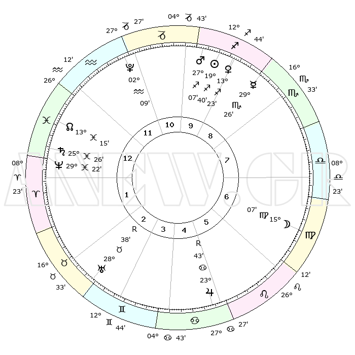 | | ΘΕΣΕΙΣ ΠΛΑΝΗΤΩΝ ΑΣΤΡΟΛΟΓΙΚΟΥ ΧΑΡΤΗ ΤΗΣ ΣΤΙΓΜΗΣ ΑΥΤΗΣ | | | | Πλανήτης | Ζώδιο | Μοίρες | Δεκαήμ. | Σε οίκο | Απόκλιση | | Ακμές των οίκων | | Ηλιος | Τοξότης | 18°49' | Δεύτερο | 6 | 22 S 58 | | 1ος | 22°02' | Δίδυμοι | | Σελήνη | Παρθένος | 04°20' | Πρώτο | 4 | 10 N 38 | | 2ος | 13°27' | Καρκίνος | | Ερμής | Σκορπιός | 28°26' | Τρίτο | 6 | 17 S 48 | | 3ος | 04°51' | Λέων | | Αφροδίτη | Τοξότης | 12°20' | Δεύτερο | 6 | 21 S 56 | | 4ος | 29°58' | Λέων | | Αρης | Τοξότης | 26°29' | Τρίτο | 7 | 24 S 08 | | 5ος | 02°32' | Ζυγός | | Δίας | Καρκίνος | 23°47'R | Τρίτο | 2 | 21 N 31 | | 6ος | 12°50' | Σκορπιός | | Κρόνος | Ιχθείς | 25°25' | Τρίτο | 10 | 03 S 58 | | 7ος | 22°01' | Τοξότης | | Ουρανός | Ταύρος | 28°40'R | Τρίτο | 12 | 19 N 39 | | 8ος | 13°27' | Αιγόκερως | | Ποσειδώνας | Ιχθείς | 29°22' | Τρίτο | 10 | 01 S 29 | | 9ος | 04°51' | Υδροχόος | | Πλούτωνας | Υδροχόος | 02°08' | Πρώτο | 8 | 23 S 21 | | 10ος | 29°58' | Υδροχόος | | Β. Δεσμός | Ιχθείς | 13°18' | Δεύτερο | 10 | 06 S 34 | | 11ος | 02°32' | Κριός | | Ωροσκόπος | Δίδυμοι | 22°02' | Τρίτο | | | 12ος | 12°50' | Ταύρος | | Μεσουράνημα | Υδροχόος | 29°58' | Τρίτο | | | |
