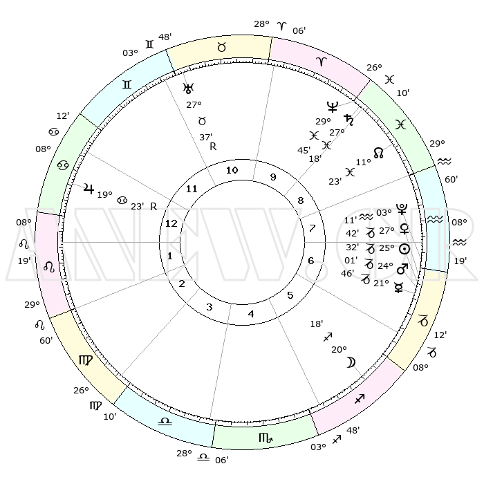 | | ΘΕΣΕΙΣ ΠΛΑΝΗΤΩΝ ΑΣΤΡΟΛΟΓΙΚΟΥ ΧΑΡΤΗ ΤΗΣ ΣΤΙΓΜΗΣ ΑΥΤΗΣ | | | | Πλανήτης | Ζώδιο | Μοίρες | Δεκαήμ. | Σε οίκο | Απόκλιση | | Ακμές των οίκων | | Ηλιος | Αιγόκερως | 25°29' | Τρίτο | 7 | 21 S 02 | | 1ος | 21°13' | Καρκίνος | | Σελήνη | Τοξότης | 19°36' | Δεύτερο | 6 | 28 S 04 | | 2ος | 11°48' | Λέων | | Ερμής | Αιγόκερως | 21°40' | Τρίτο | 7 | 23 S 29 | | 3ος | 05°41' | Παρθένος | | Αφροδίτη | Αιγόκερως | 27°37' | Τρίτο | 7 | 21 S 37 | | 4ος | 05°29' | Ζυγός | | Αρης | Αιγόκερως | 23°59' | Τρίτο | 7 | 22 S 16 | | 5ος | 11°31' | Σκορπιός | | Δίας | Καρκίνος | 19°24'R | Δεύτερο | 12 | 22 N 18 | | 6ος | 18°42' | Τοξότης | | Κρόνος | Ιχθείς | 27°18' | Τρίτο | 9 | 03 S 06 | | 7ος | 21°13' | Αιγόκερως | | Ουρανός | Ταύρος | 27°37'R | Τρίτο | 11 | 19 N 26 | | 8ος | 11°48' | Υδροχόος | | Ποσειδώνας | Ιχθείς | 29°45' | Τρίτο | 9 | 01 S 19 | | 9ος | 05°41' | Ιχθείς | | Πλούτωνας | Υδροχόος | 03°11' | Πρώτο | 7 | 23 S 08 | | 10ος | 05°29' | Κριός | | Β. Δεσμός | Ιχθείς | 11°24' | Δεύτερο | 9 | 07 S 17 | | 11ος | 11°31' | Ταύρος | | Ωροσκόπος | Καρκίνος | 21°13' | Τρίτο | | | 12ος | 18°42' | Δίδυμοι | | Μεσουράνημα | Κριός | 05°29' | Πρώτο | | | |